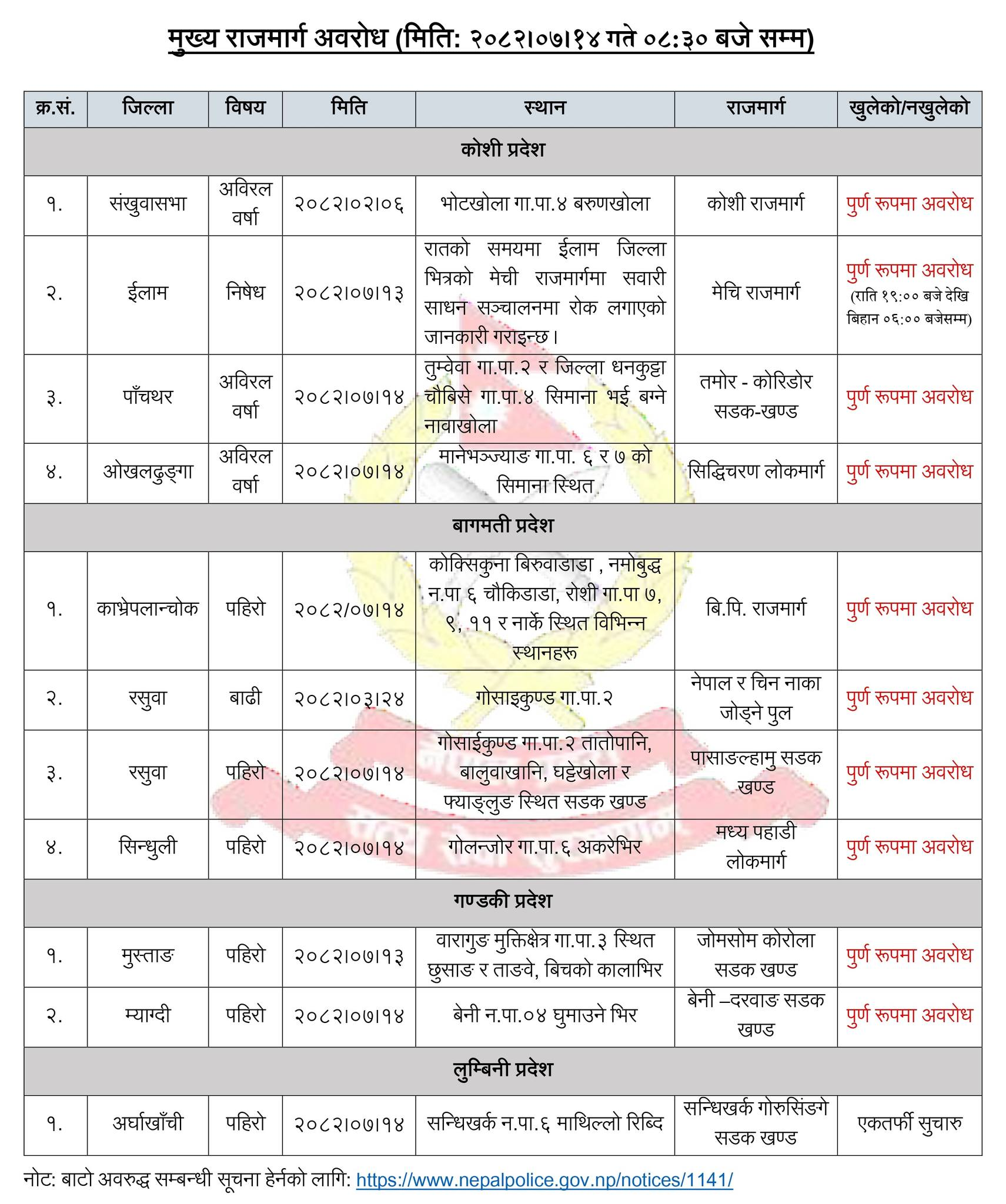 प्रहरी प्रधान कार्यालयका अनुसार कोशी राजमार्गअन्तर्गत पहिरोले सङ्खुवासभा खण्ड, पाँचथरमा तमोर करिडोर, ओखलढुङ्गामा सिद्धिचरण राजमार्ग, काभ्रेपलाञ्चोकको नमोबुद्धमा बिपी राजमार्ग, रसुवामा पासाङल्हामु राजमार्ग र नेपाल चीन जोड्ने पुल, सिन्धुलीमा मध्यपहाडी लोकमार्ग अवरुद्ध भएका हुन् ।