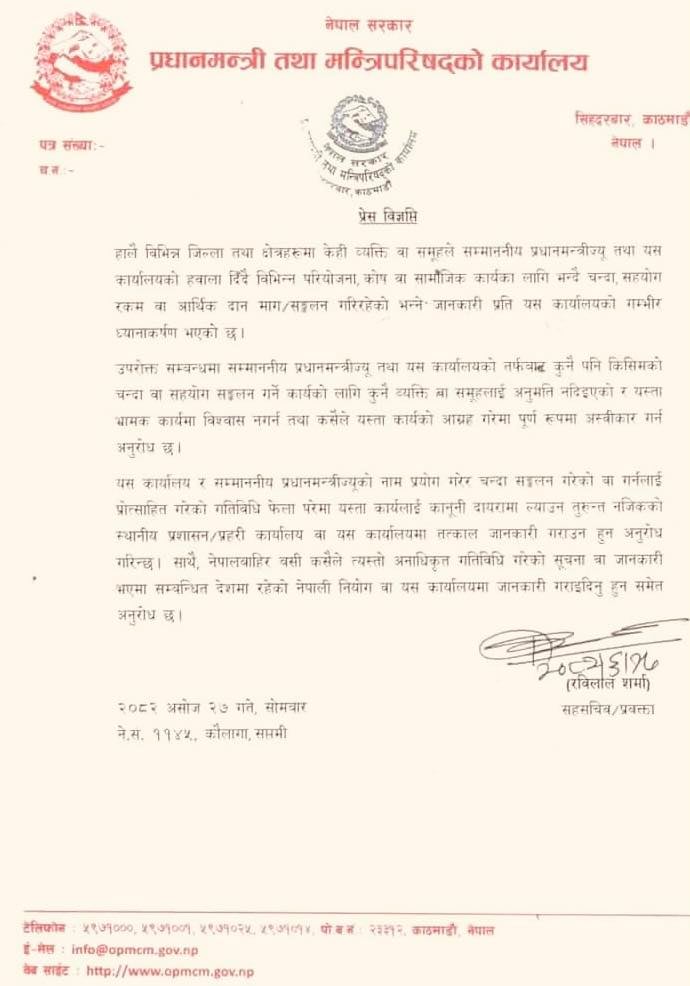 सोमबार विज्ञप्ति जारी गर्दै प्रधानमन्त्रीको कार्यालयले कुनै व्यक्ति वा समूहलाई प्रधानमन्त्री कार्कीको नाममा आर्थिक संकलन गर्ने अधिकार नदिइएको उल्लेख गरेको छ । विभिन्न जिल्लामा केही समूहले प्रधानमन्त्री तथा कार्यालयको हवाला दिँदै परियोजना, कोष वा सामाजिक कामका लागि चन्दा, सहयोग रकम वा दान माग गर्दै आएको ध्यानाकर्षण भएको विज्ञप्तिमा उल्लेख छ ।