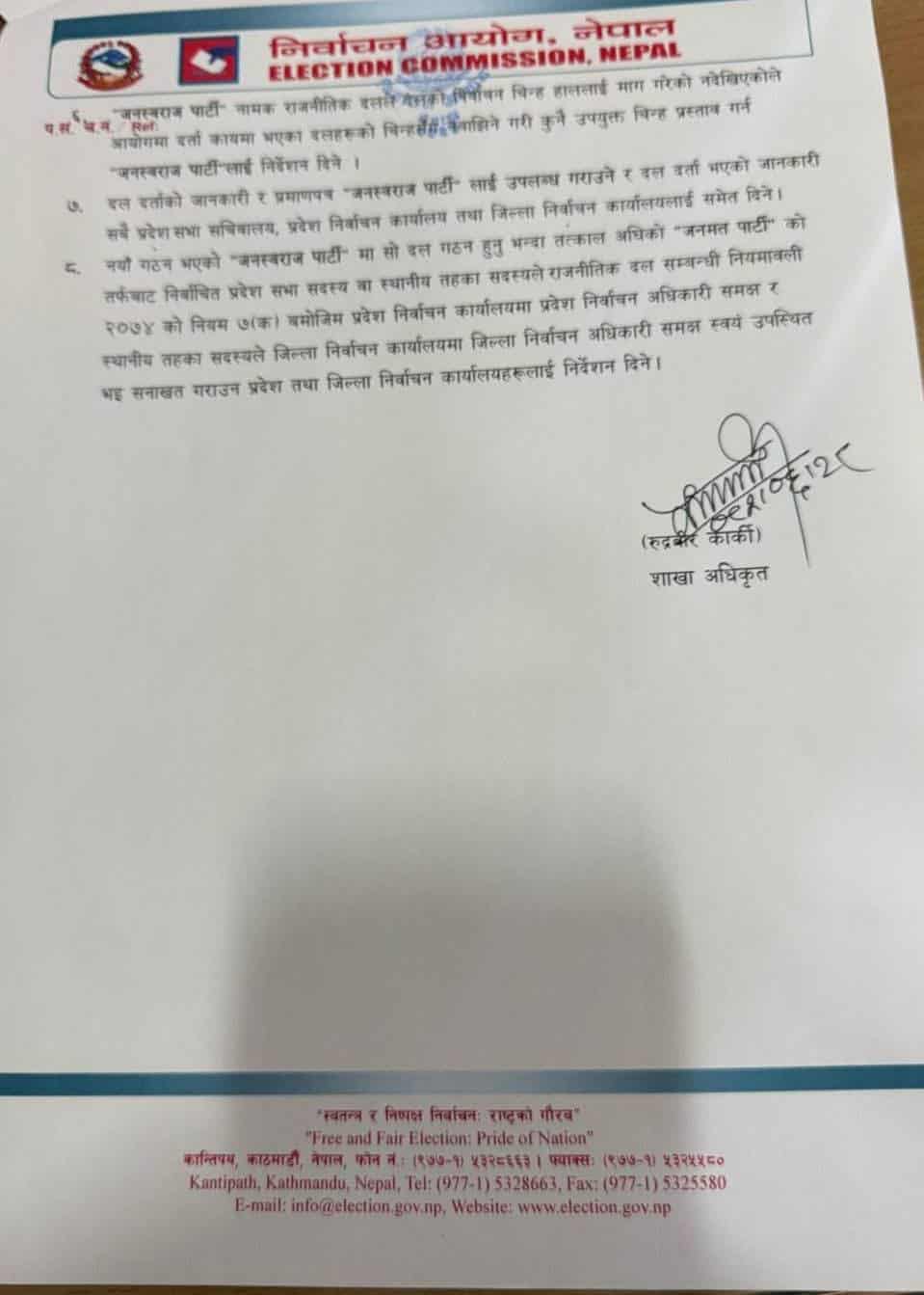 काठमाडौं : जनस्वराज पार्टीले नयाँ राजनीतिक यात्रा सुरु गर्दै जेनजी विद्रोहबाट प्रेरित स्वराजको अवधारणालाई अगाडि सारेको छ । यो पार्टी सिके राउत नेतृत्वको जनमत पार्टीबाट फुटेर बनेको हो र निर्वाचन आयोगमा दर्ता भइसकेको छ । जनस्वराज पार्टीले "समृद्धि, सामाजिक न्याय र जनताको पूर्ण स्वशासन"लाई वैचारिक आधार बनाएको छ।