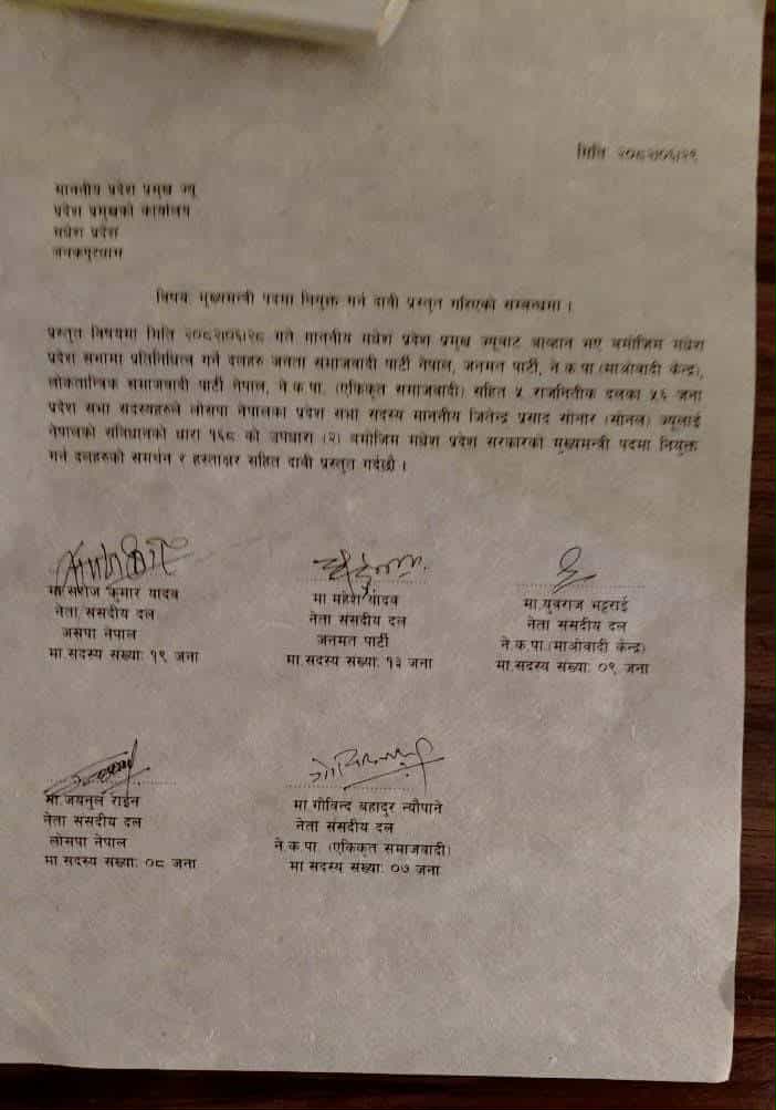 काठमाडौँ : मधेश प्रदेशको मुख्यमन्त्रीमा लोसपाका उपाध्यक्ष जितेन्द्र सोनल दाबी पेस गरेका छन् । नेकपा माओवादी केन्द्र, जनमत पार्टी, जसपा र एकीकृत समाजवादीको समर्थनमा उनले प्रदेश प्रमुखसमक्ष दाबी पेस गरेका हुन् ।