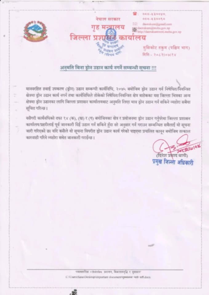 प्रशासनले चेतावनी दिँदै सूचना विपरीत ड्रोन उडाएमा प्रचलित कानुनबमोजिम तत्काल कारबाही हुने जनाएको छ ।