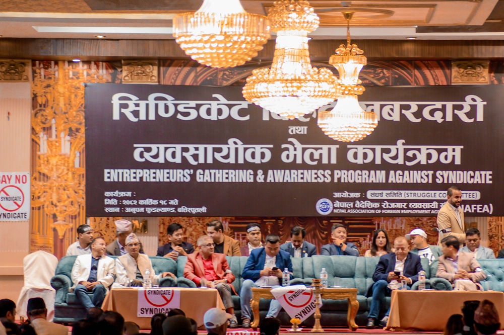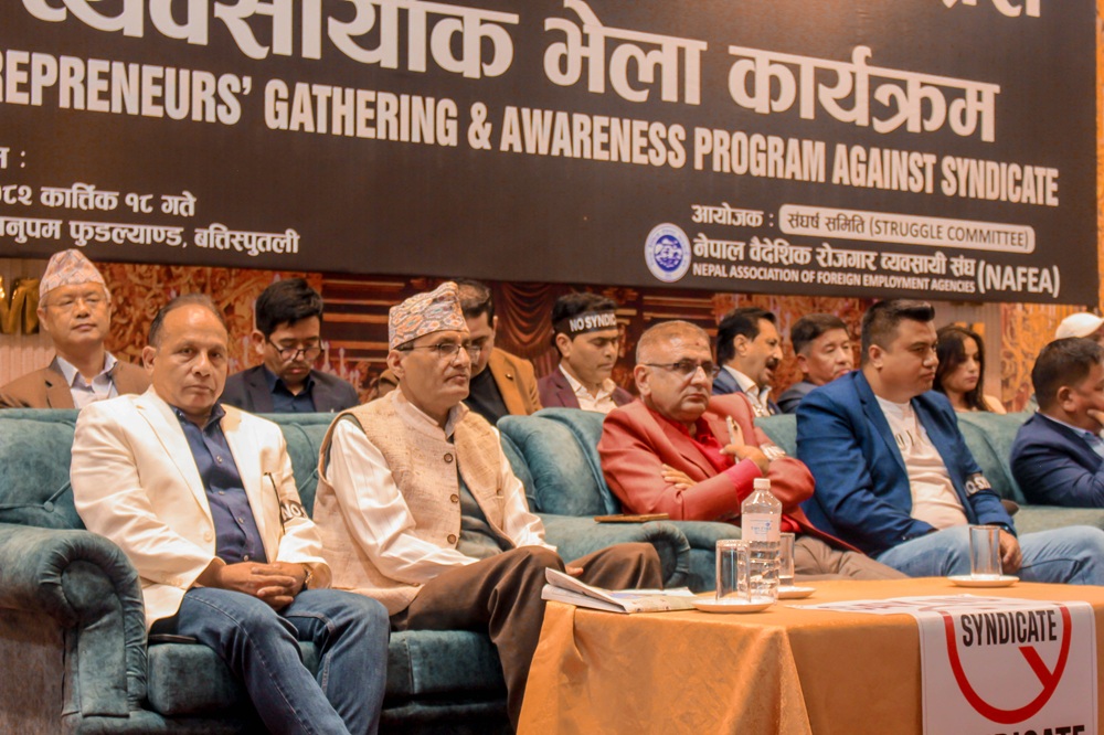 नेपाल लोकतान्त्रिक वैदेशिक रोजगार व्यवसायी एसोसिएसनका अध्यक्ष दीपक थापाले ‘१ हजार भन्दा बढी ब्यवसायीको पेटमा लात हानेर ८/९ जनाले मात्रै व्यापार गर्ने’ प्रवृत्तिविरुद्ध एकताबद्ध हुनुपर्नेमा जोड दिए । केही समय पहिले नै सिन्डिकेटधारी सक्रिय रहेकोमा विभिन्न कारणले शिथिल भएको, तर अहिले सरकार परिवर्तनका कारण अवस्था तरल भएकाले उनीहरू फेरि सक्रिय भएकाले व्यवसायी एकजुट हुन जरुरी रहेको बताए ।