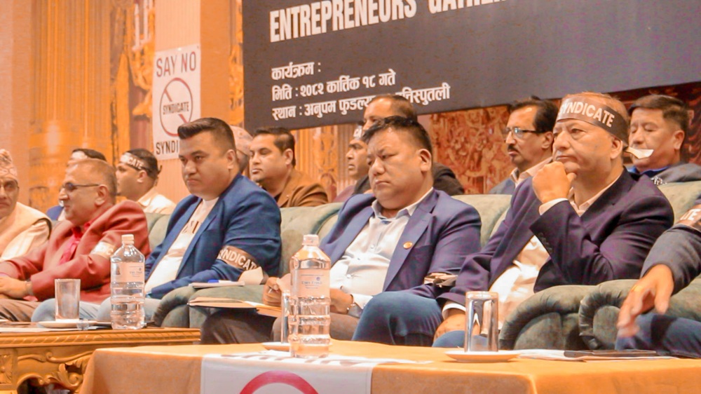 संघका अध्यक्ष भुवनसिंह गुरुङले आफ्नो संघको गत निर्वाचनको मुख्य एजेन्डा नै सिन्डिकेटको विरोध रहेको बताउँदै वर्तमान कार्यसमिति सिन्डिकेटविरुद्ध कडाइका साथ उभिएको बताए । केही व्यवसायीले अनेकौं शंका–उपशंका गरेर सामाजिक सञ्जालमा लेख्ने गरे पनि संघको कार्यसमिति सिन्डिकेटविरुद्ध प्रतिबद्ध रहेको भन्दै अध्यक्ष गुरुङले भने, ‘ढुक्क हुनुस्, जताबाट तौलिए पनि वर्तमान कार्यसमिति फस्दैन, सिन्डिकेट लाग्दैन ।’