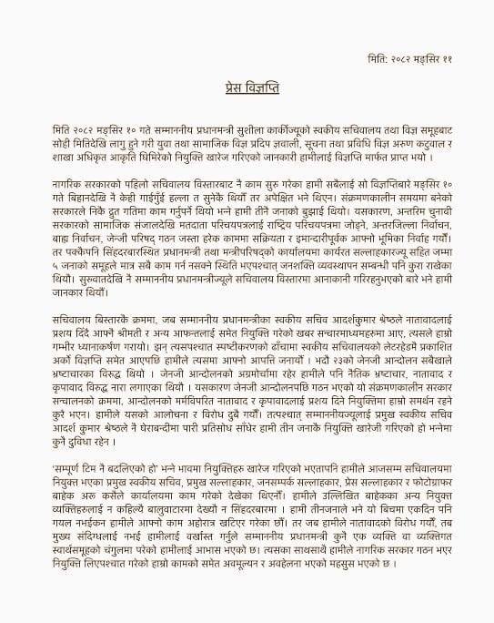 तीनैजना मिलेर जारी गरेको विज्ञप्तिमा भनिएको छ, 'प्रधानमन्त्रीका प्रमुख स्वकीय सचिव आदर्शकुमार श्रेष्ठले आफ्नी श्रीमती र अन्य नातेदारलाई सचिवालयमा गरेको भर्तीकै विषयमा हामीले उठाएको प्रश्नका कारण ‘प्रतिशोध’ स्वरूप पदबाट हटाइएको हो ।'