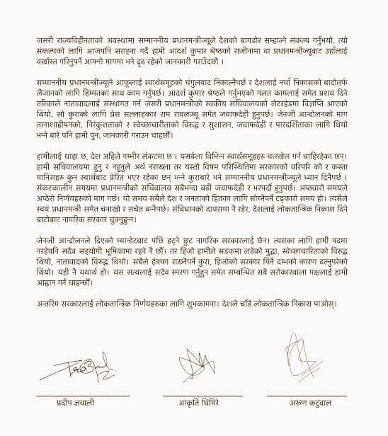 ज्ञवाली, कटुवाल र घिमिरेले प्रधानमन्त्री कार्कीलाई कुनै विशेष समूहको प्रभावबाट बाहिर निस्केर राष्ट्रहितमा निर्णय लिन आग्रह गरेका छन् । साथै उनीहरूले प्रमुख स्वकीय सचिव आदर्श श्रेष्ठलाई हटाउनुपर्ने माग दोहोर्याएका छन् ।