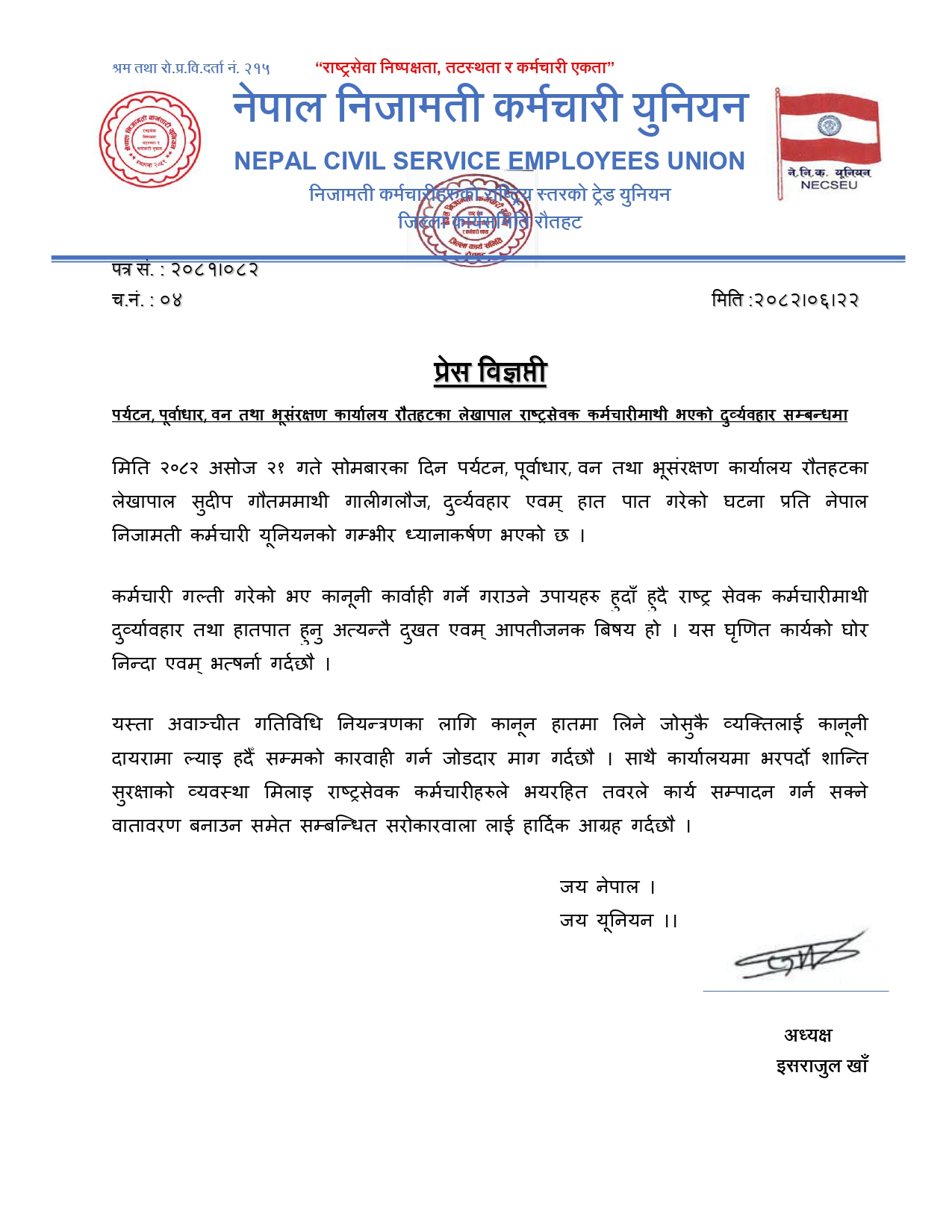 काठमाडौंः पर्यटन, पूर्वाधार, वन तथा भूसंरक्षण कार्यालय रौतहटका लेखापाल सुदीप गौतममाथि भएको दुर्व्यवहारप्रति नेपाल निजामती कर्मचारी युनियन, रौतहटले ध्यानाकर्षण गरेको छ । युनियनले बुधबार एक विज्ञप्ति जारी गर्दै गौतममाथि भएको दुर्व्यवहारप्रति ध्यानाकर्षण गरेको हो ।