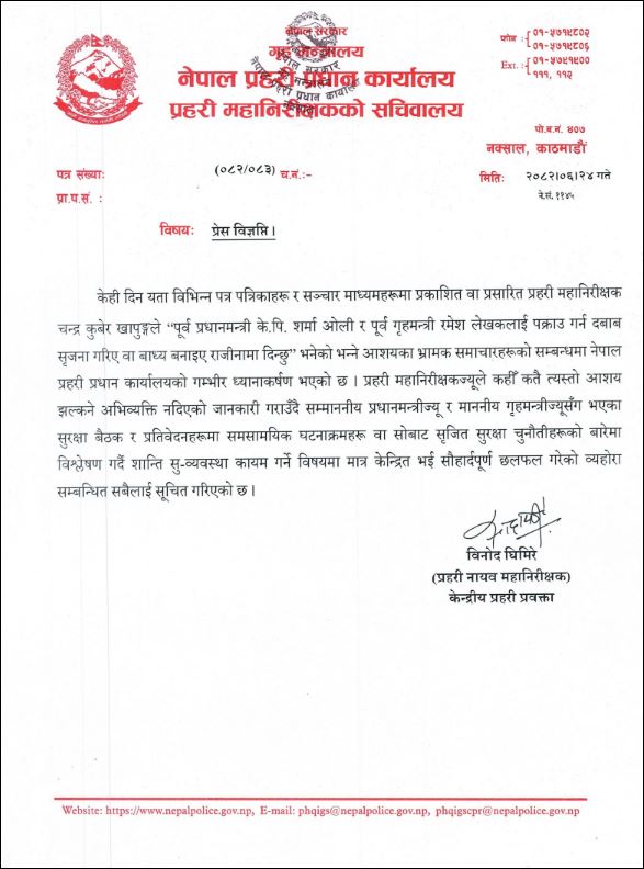 विज्ञप्तिमा भनिएको छ, “प्रहरी महानिरीक्षकले कुनै पनि मञ्च वा छलफलमा यस्तो आशयको कुरा व्यक्त गर्नुभएको छैन । विभिन्न सञ्चारमाध्यममा आएका यस्ता समाचार निराधार छन् ।”