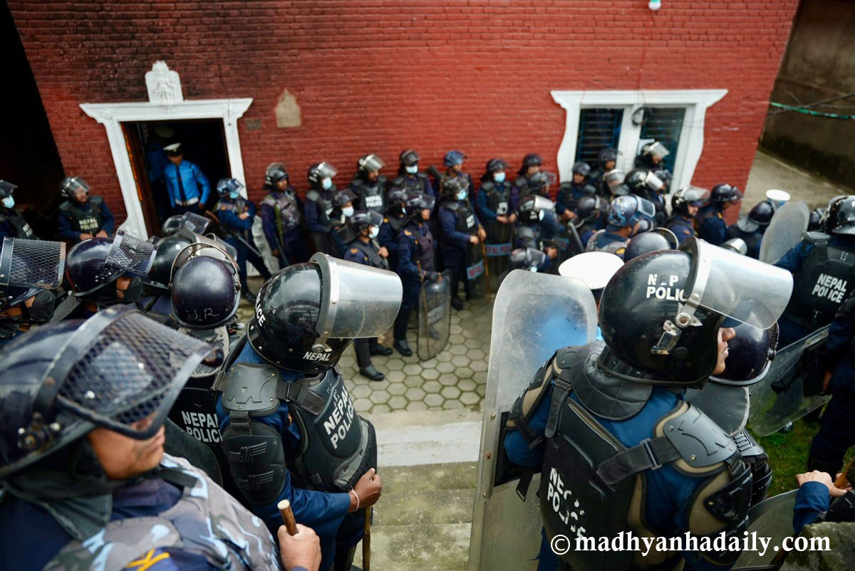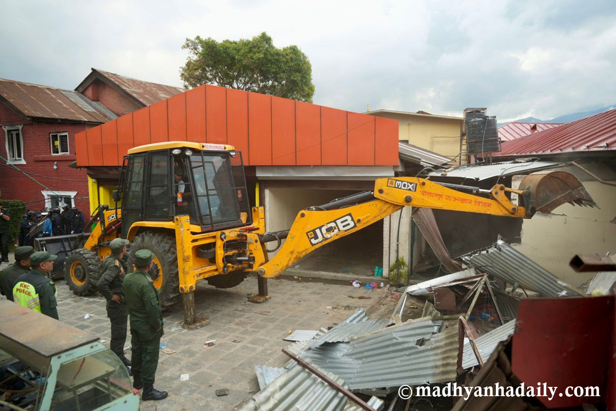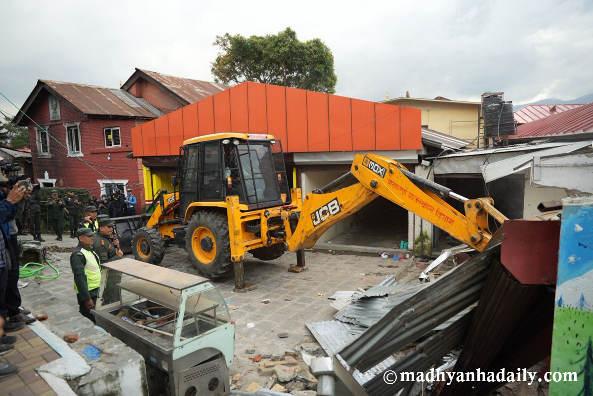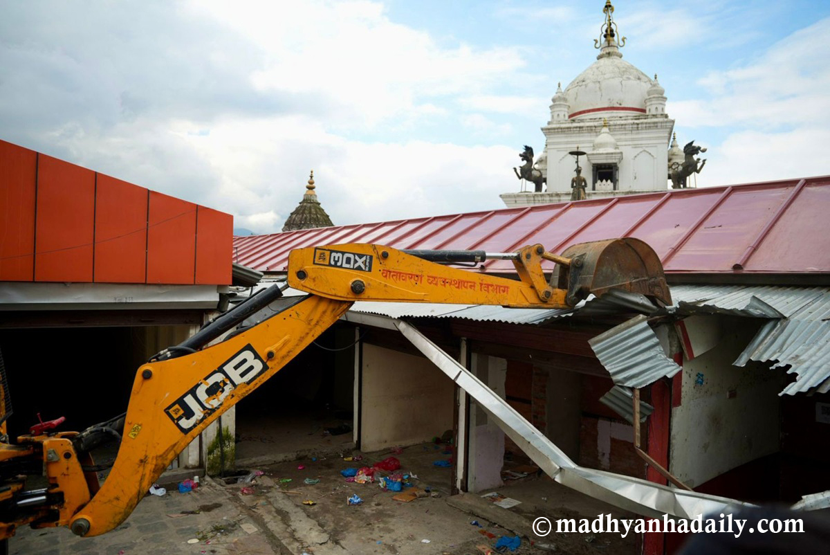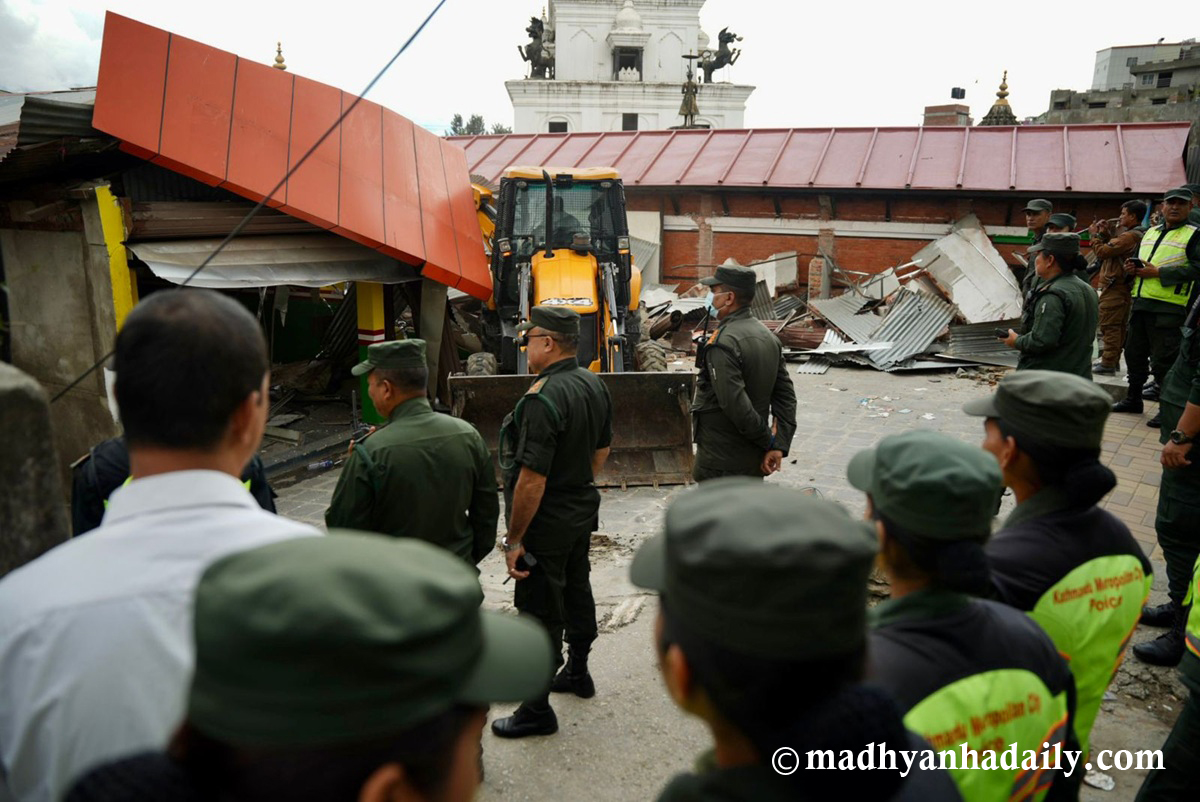 काठमाडौं : काठमाडौं महानगरपालिकाले थापाथलीस्थित राम मन्दिर परिसरमा रहेको ट्राफिक प्रहरी प्रभागमा डोजर चलाएको छ । सम्पदा क्षेत्रमा निर्माण गरिएको सो संरचनामा महानगरले डोजर चलाएको हो । सम्पदा क्षेत्र खुल्ला राख्ने र संरक्षण गर्ने उद्देश्यका साथ सो क्षेत्रमा निर्माण गरिएको अवैध संरचना हटाइएको हो ।