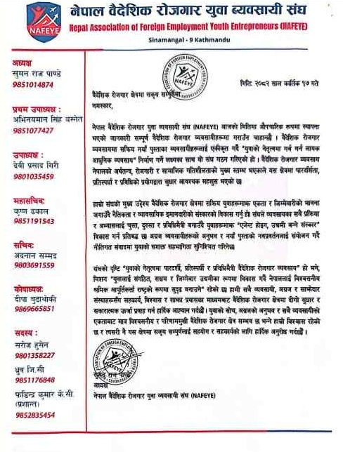 वैदेशिक रोजगार व्यवसायमा सक्रिय नयाँ पुस्ताका व्यवसायीहरूलाई एकीकृत गर्दै ‘युवाको नेतृत्वमा गर्व गर्न लायक आधुनिक व्यवसाय’ निर्माण गर्ने लक्ष्यका साथ नयाँ संघ गठन गरिएको संस्थाद्वारा जारी विज्ञप्तिमा उल्लेख छ ।