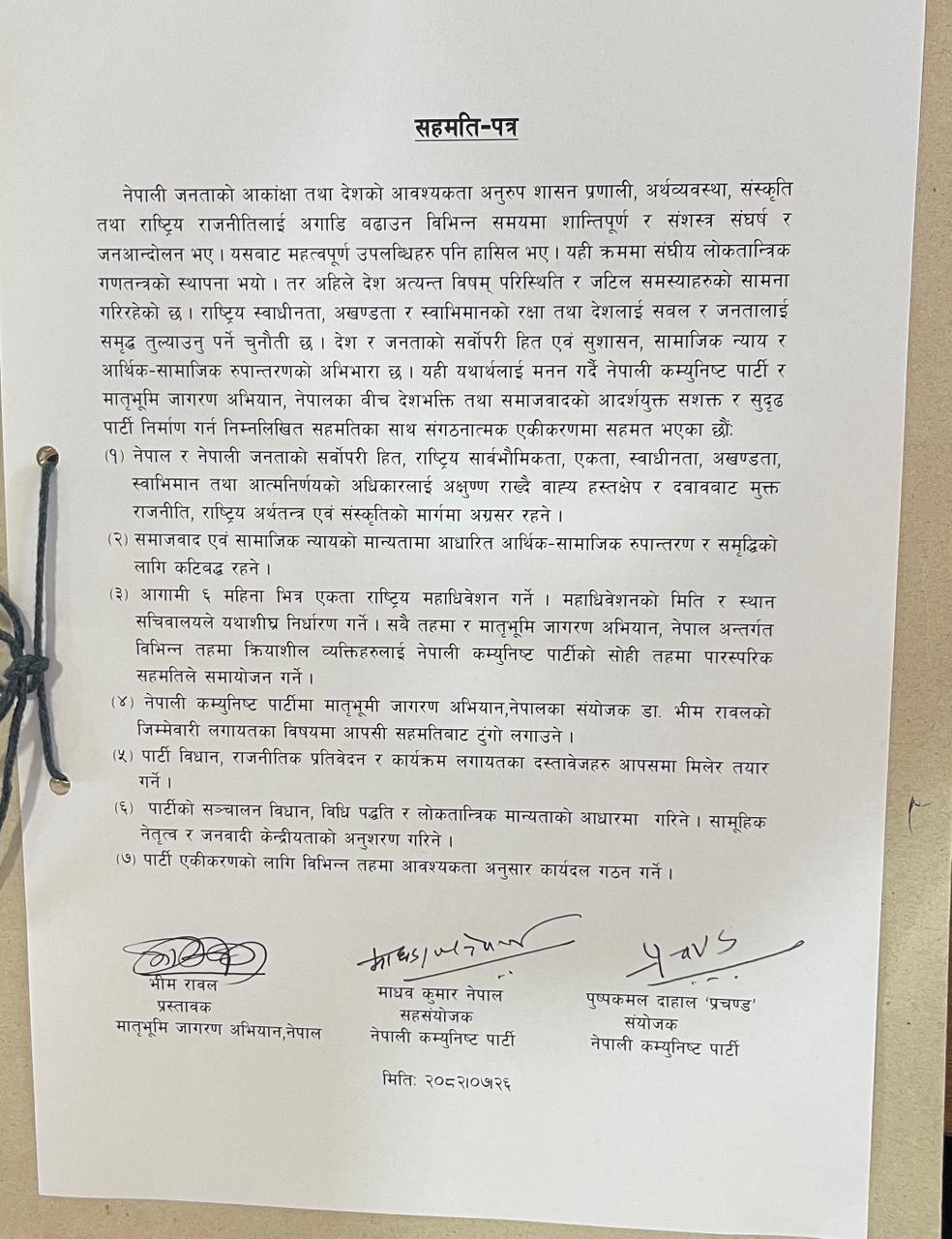 काठमाडौं : नेपाली कम्युनिष्ट पार्टी र भीम रावल नेतृत्वको 'मातृभूमि जागरण अभियान, नेपाल' का बीच आज पेरिसडाँडामा सहमति पत्रमा हस्ताक्षर भएको छ ।