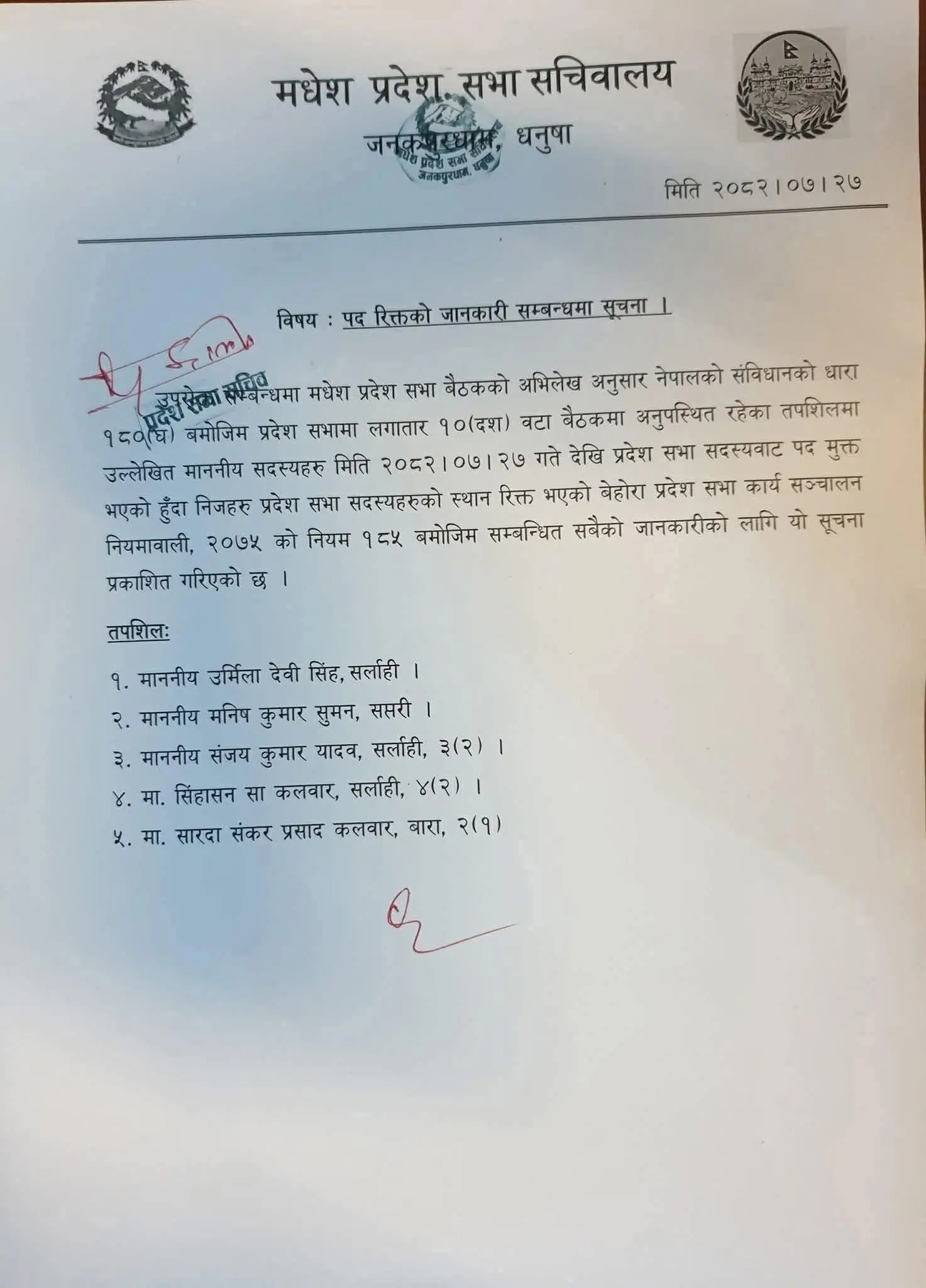 मधेशका सभामुख रामचन्द्र मण्डलले लगातार १० पटक प्रदेशसभा बैठकमा अनुपस्थित भएको भन्दै पाँच सांसदलाई पदमुक्त गरेका हुन् ।