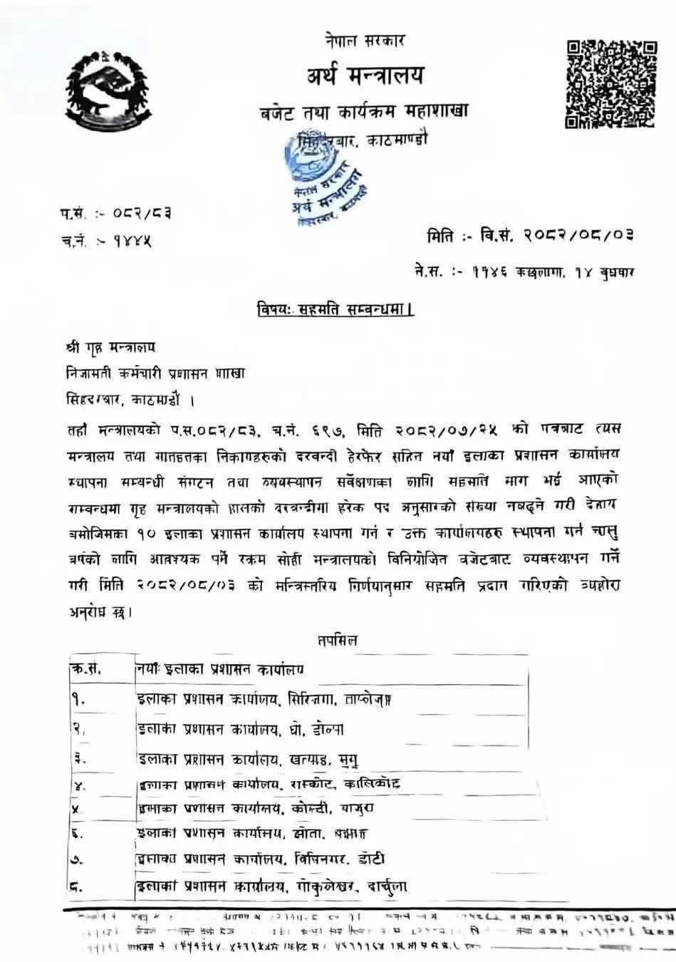 इलाका प्रशासन कार्यालय राख्न सहमति प्रदान गरेको अर्थ मन्त्रालयले जानकारी दिएको छ ।