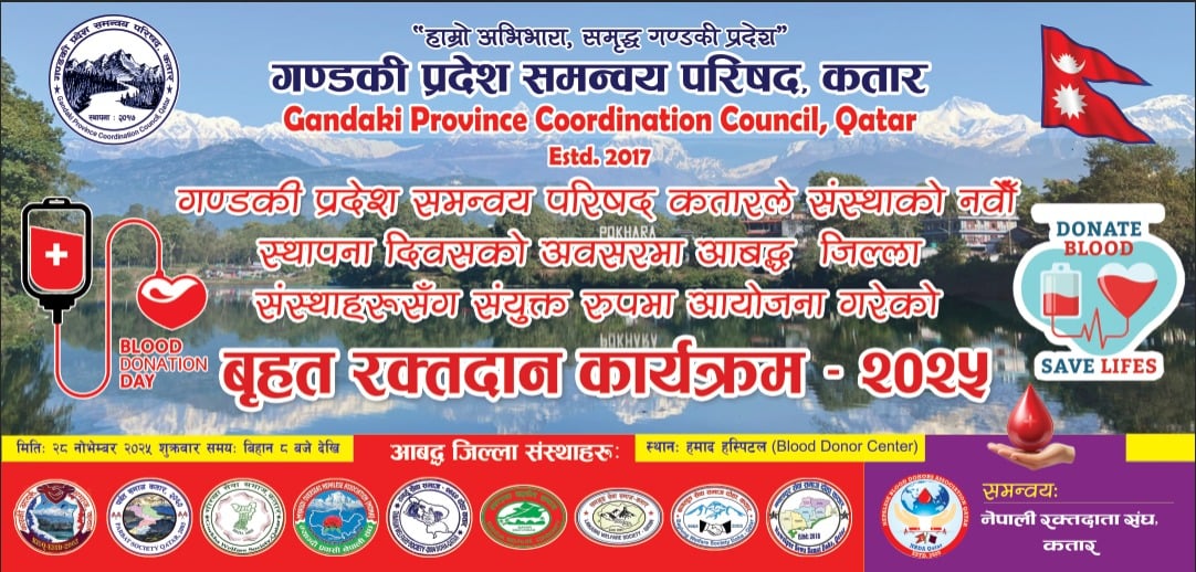 दोहा कतार : कतारमा रहेका गण्डकी प्रदेश बासीहरूको अभिभावक संस्था गण्डकी प्रदेश समन्वय परिषद् कतारको नवौं स्थापना दिवसको अवसरमा प्रदेशमा आबद्ध जिल्ला संस्थाहरुसँगको संयुक्त आयोजनामा शुक्रबार सम्पन्न हुने बृहत् रक्तदान कार्यक्रमको तयारी पूरा भएको छ ।