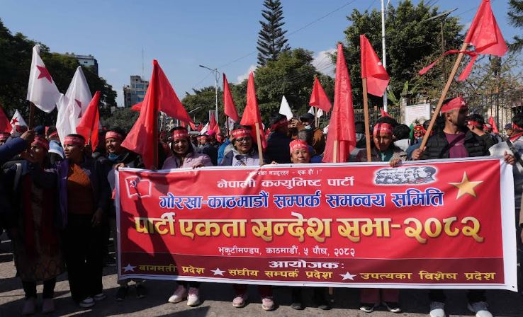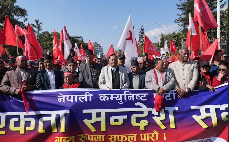 काठमाडौँ : नेपाली कम्युनिस्ट पार्टी (नेकपा) को एकता सन्देशसभा र्याली सुरु भएको छ । काठमाडौंको भृकुटीमण्डपमा आज आयोजना गरिएको एकता सन्देश सभाका लागि सुन्धारा, शान्तिबाटिकालगायत विभिन्न स्थानबाट र्याली सुरु भएको हो ।