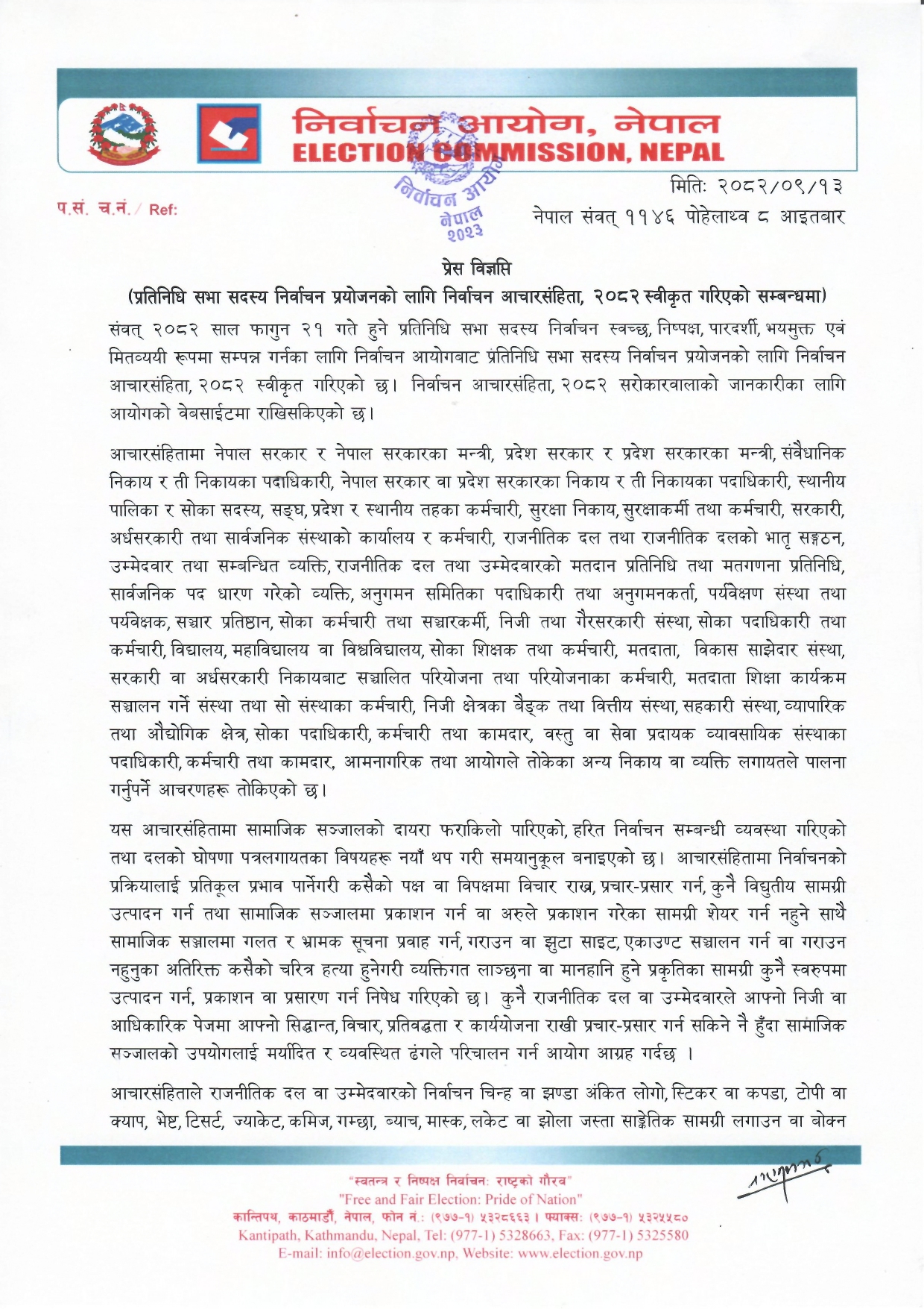 काठमाडौं : निर्वाचन आयोगले प्रतिनिधिसभा सदस्य निर्वाचनलाई स्वच्छ, निष्पक्ष, पारदर्शी र भयमुक्त रूपमा सम्पन्न गर्न निर्वाचन आचारसंहिता, २०८२ स्वीकृत गरेको छ ।