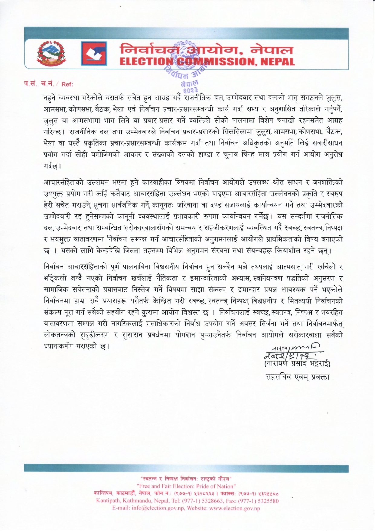 राजनीतिक दल, उम्मेदवार तथा सरोकारवालालाई सभ्य र अनुशासित ढंगले प्रचारप्रसार गर्न आयोगले आग्रह गरेको छ । आचारसंहिता उल्लंघन भएमा जरिवाना, दण्ड सजायदेखि उम्मेदवारी रद्दसम्मको कारबाही हुने चेतावनी दिइएको छ ।
