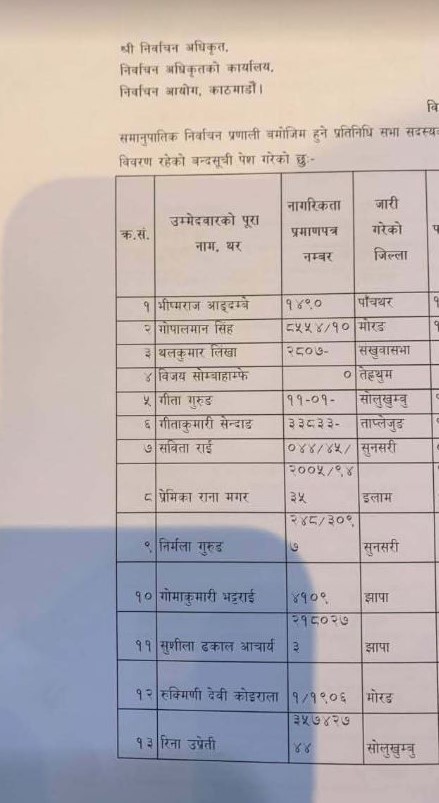 केसीको उम्मेदवारीलाई लिएर पार्टीभित्रै विरोध भएपछि महामन्त्री गगन थापाले असहमति व्यक्त गरेका छन् । सूचीमा पूर्वराष्ट्रपति रामवरण यादवका छोरा चन्द्रमोहन यादव र वर्तमान राष्ट्रपति रामचन्द्र पौडेलकी छोरी संज्ञा पोखरेल पौडेलसमेत रहेका छन् ।