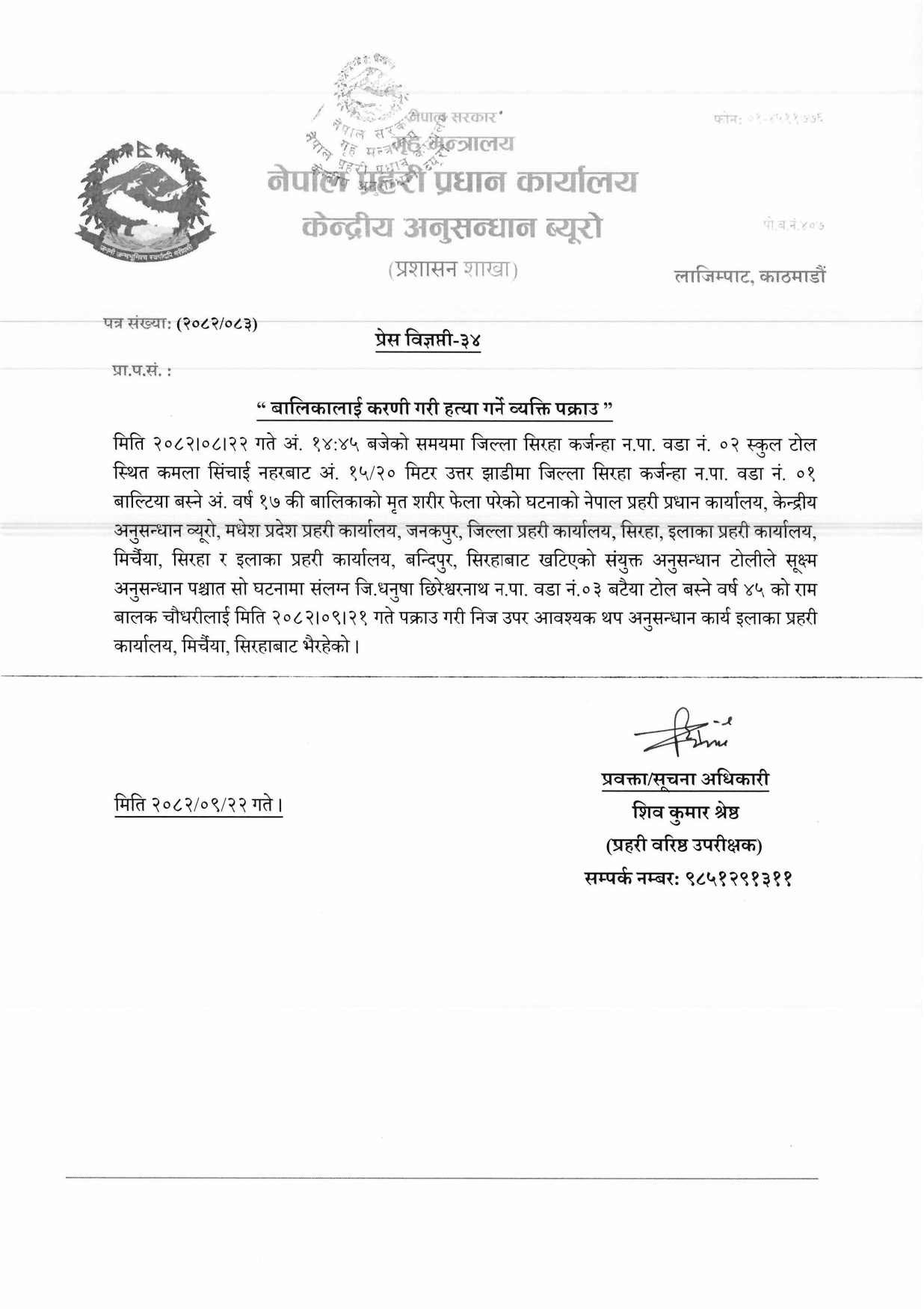 गत मंसिर २२ गते अपराह्न करिब २ः४५ बजे कर्जन्हा नगरपालिका–२ स्कुल टोलस्थित कमला सिँचाइ नहरबाट करिब १५–२० मिटर उत्तरतर्फको झाडीमा कर्जन्हा नगरपालिका–१ बाल्टिया टोलकी करिब १७ वर्षीया बालिकाको मृत शरीर फेला परेको थियो ।