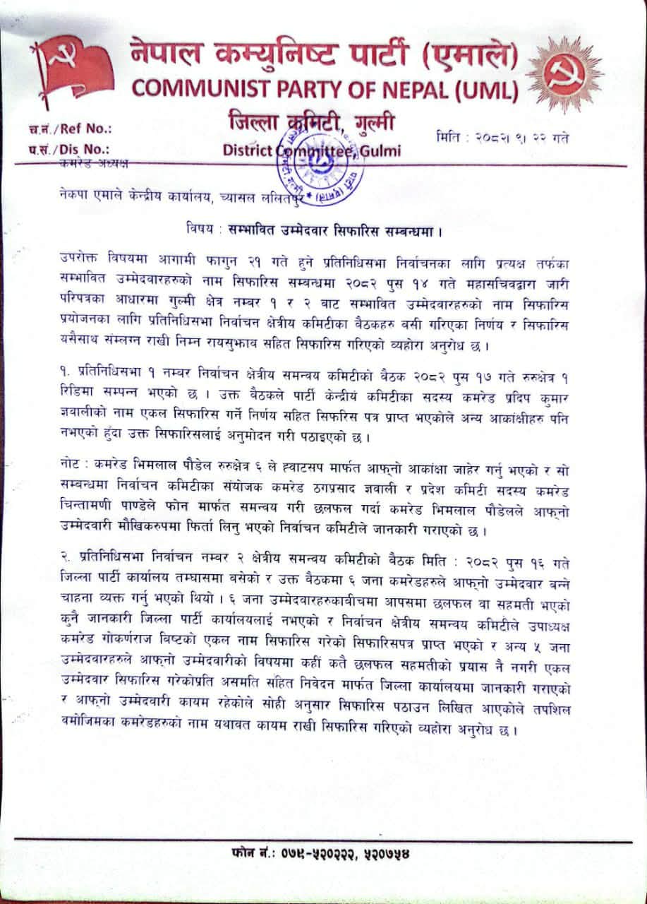 गुल्मी : आगामी फागुन २१ गते हुने प्रतिनिधिसभा निर्वाचनका लागि नेकपा (एमाले) गुल्मीले दुवै निर्वाचन क्षेत्रमा प्रत्यक्षतर्फका सम्भावित उम्मेदवारहरूको नाम केन्द्रीय कार्यालयमा सिफारिस गरेको छ । पार्टी केन्द्रीय कार्यालय च्यासल, ललितपुरलाई पठाइएको सिफारिस पत्र अनुसार गुल्मी निर्वाचन क्षेत्र नम्बर–१ मा पार्टी केन्द्रीय कमिटी सदस्य प्रदीपकुमार ज्ञवालीको नाम एकल रूपमा सिफारिस गरिएको छ ।