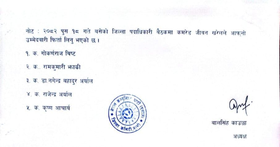 जिल्ला पार्टी अध्यक्ष बालसिंह काउछाका अनुसार सबै प्रक्रियागत निर्णय र रायसुझावसहित सिफारिस केन्द्रमा पठाइएको छ र अन्तिम निर्णय पार्टी केन्द्रीय कमिटीले गर्नेछ ।