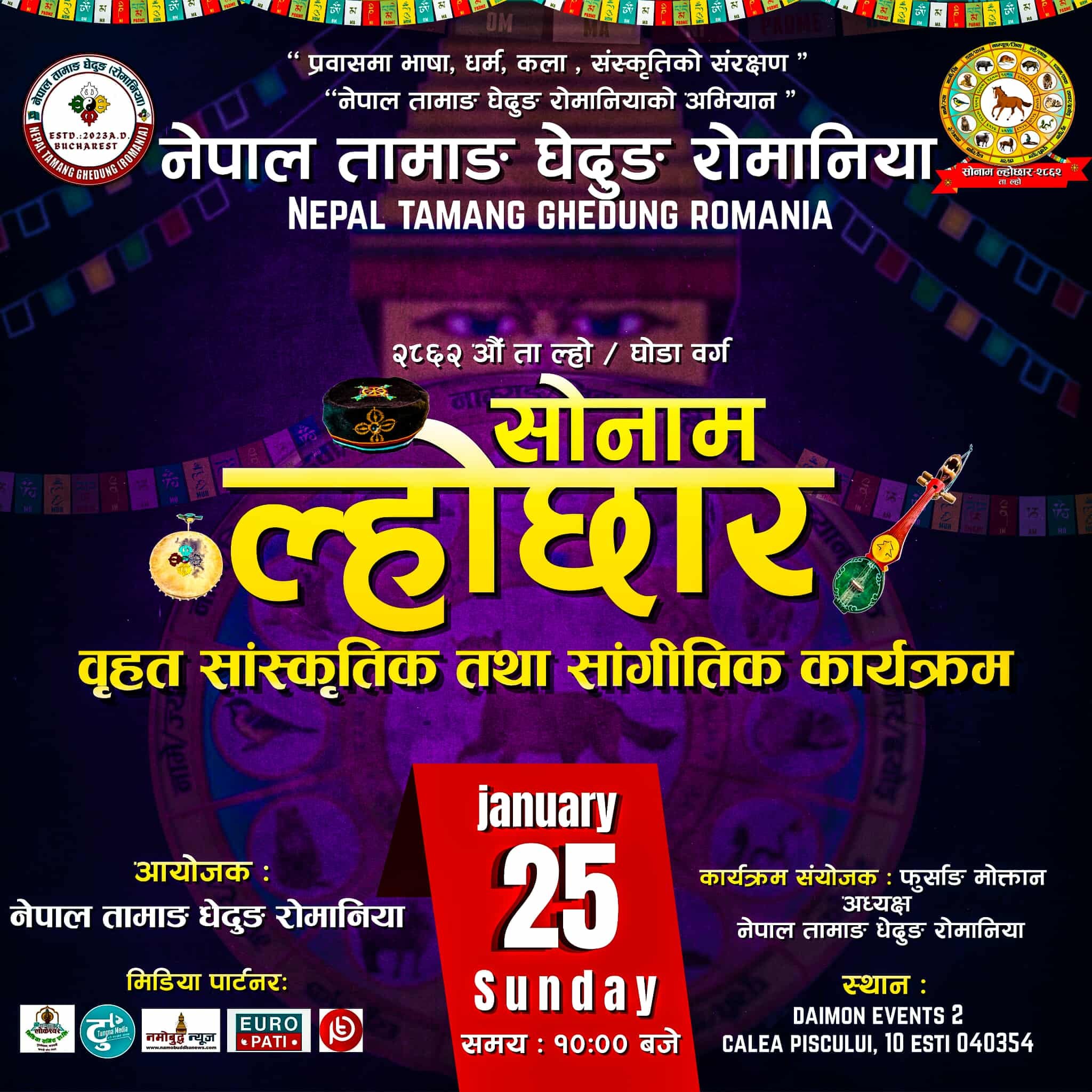 रोमानिया : मञ्जुश्री संवत् २८६२औं (ता-ल्हो) अर्थात् घोडा वर्गको सोनाम ल्होछारको अवसरमा माघ महिनाभर तामाङ समुदायका विभिन्न संघ संस्थाहरूले विश्वव्यापी रूपमा विभिन्न कार्यक्रम आयोजना गरी मनाउने गरिन्छ । यसै सन्दर्भमा नेपाल तामाङ घेदुङ रोमानियाको आयोजनामा जनवरी २५ तारिख बुखारेष्टको डाईमन इभेन्ट्स-२ सभा हलमा ल्होछार मनाउन लागेको हो ।