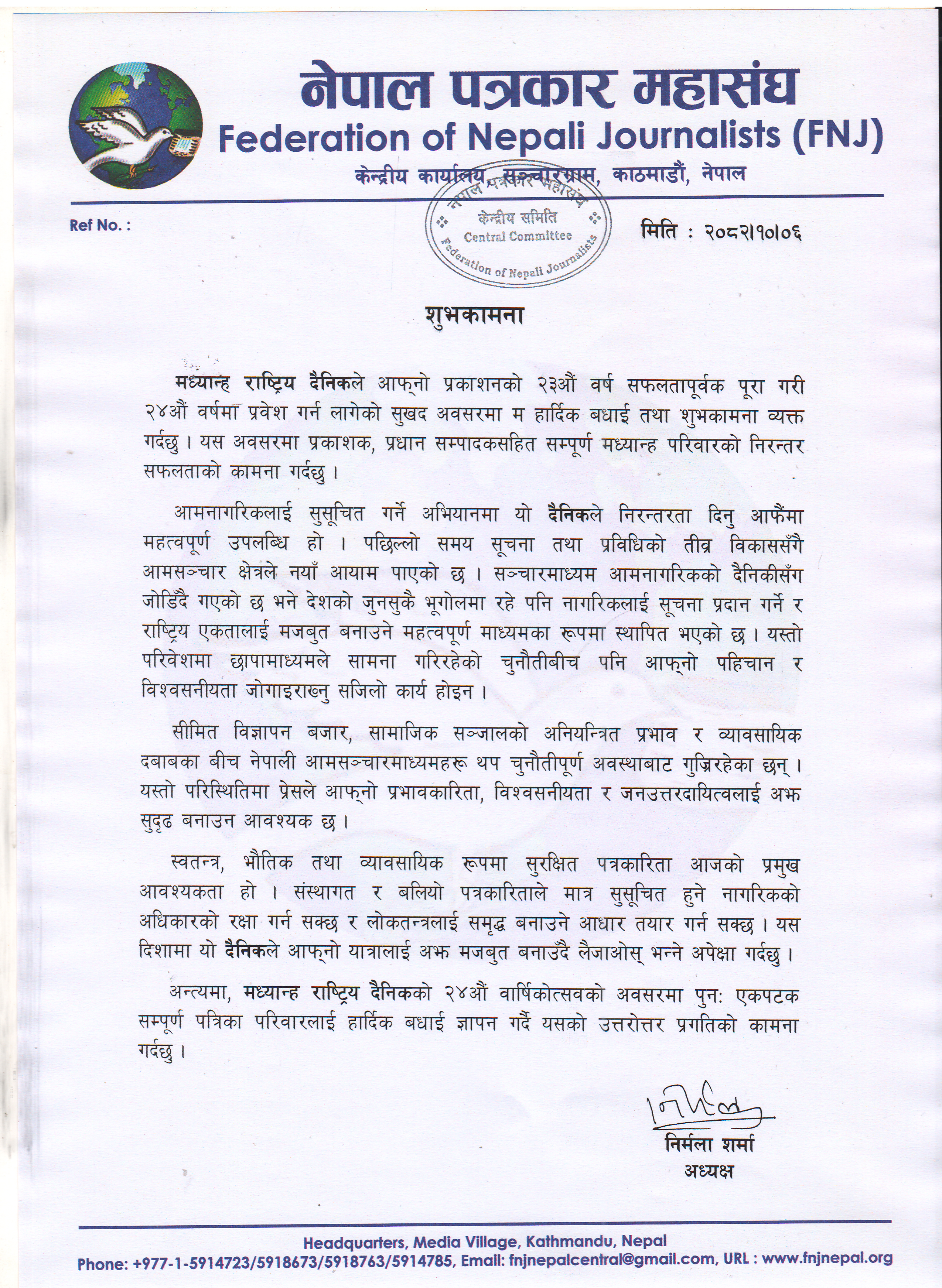 नेपाल पत्रकार महासंघकी अध्यक्ष निर्मला शर्माले पनि मध्यान्ह दैनिकको निरन्तरता आफैंमा महत्वपूर्ण उपलब्धि भएको उल्लेख गर्दै सीमित विज्ञापन बजार, सामाजिक सञ्जालको अनियन्त्रित प्रभाव र व्यावसायिक दबाबका बीच पनि पहिचान र विश्वसनीयता जोगाइराख्नु चुनौतीपूर्ण भएको बताएकी छन् । स्वतन्त्र, सुरक्षित र उत्तरदायी पत्रकारितामार्फत लोकतन्त्र सुदृढ गर्न मध्यान्ह दैनिकले आफ्नो यात्रालाई अझ मजबुत बनाओस् भन्ने अपेक्षा उनले व्यक्त गरेकी छन् ।