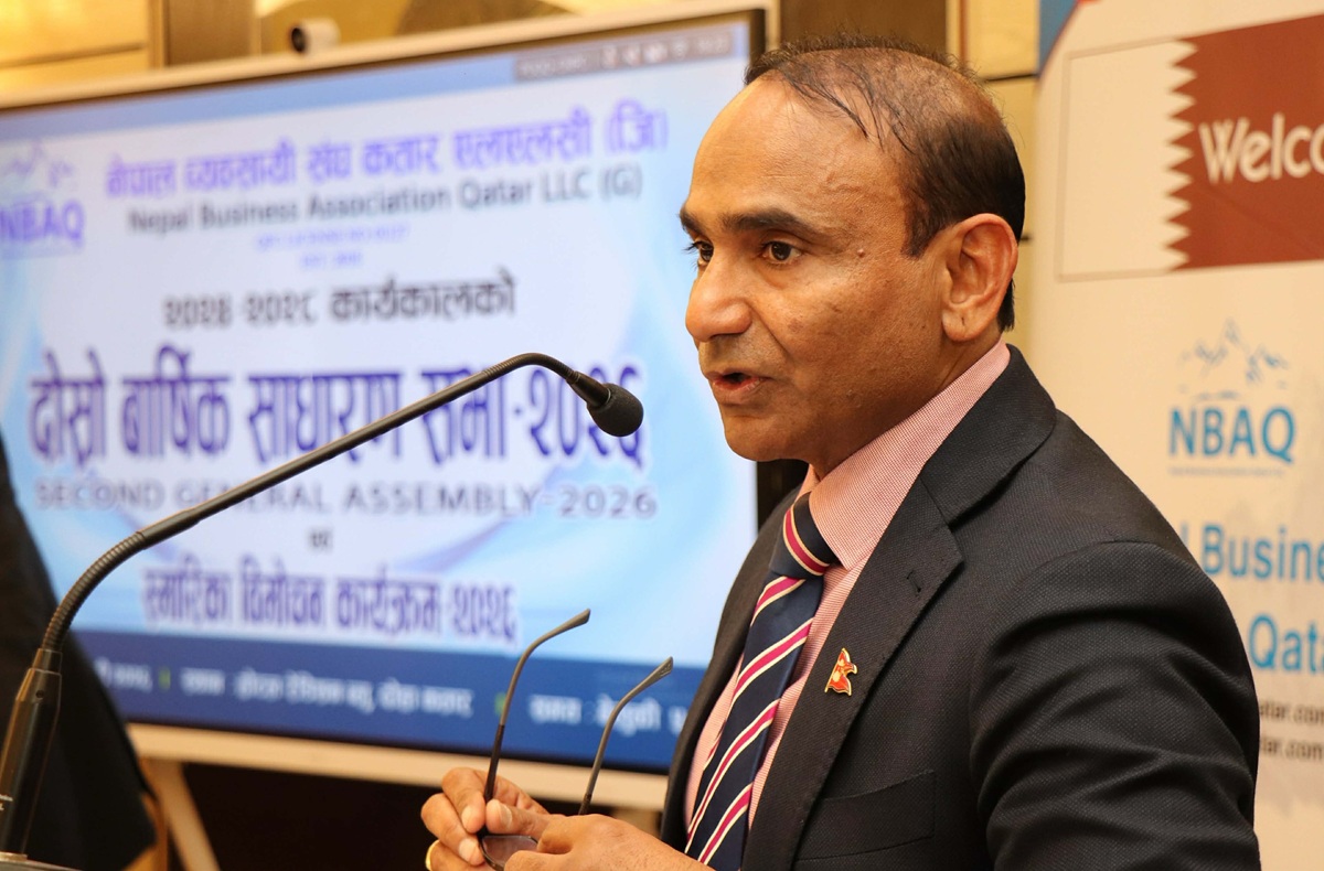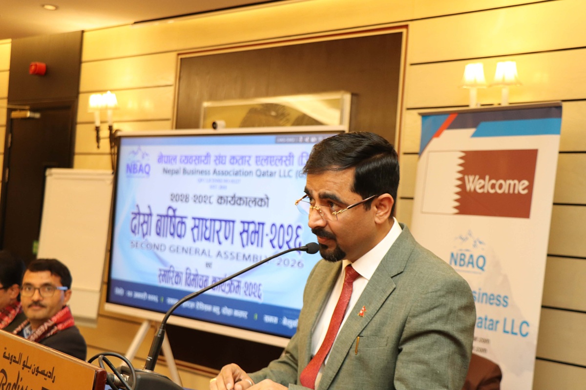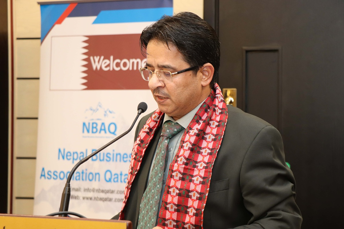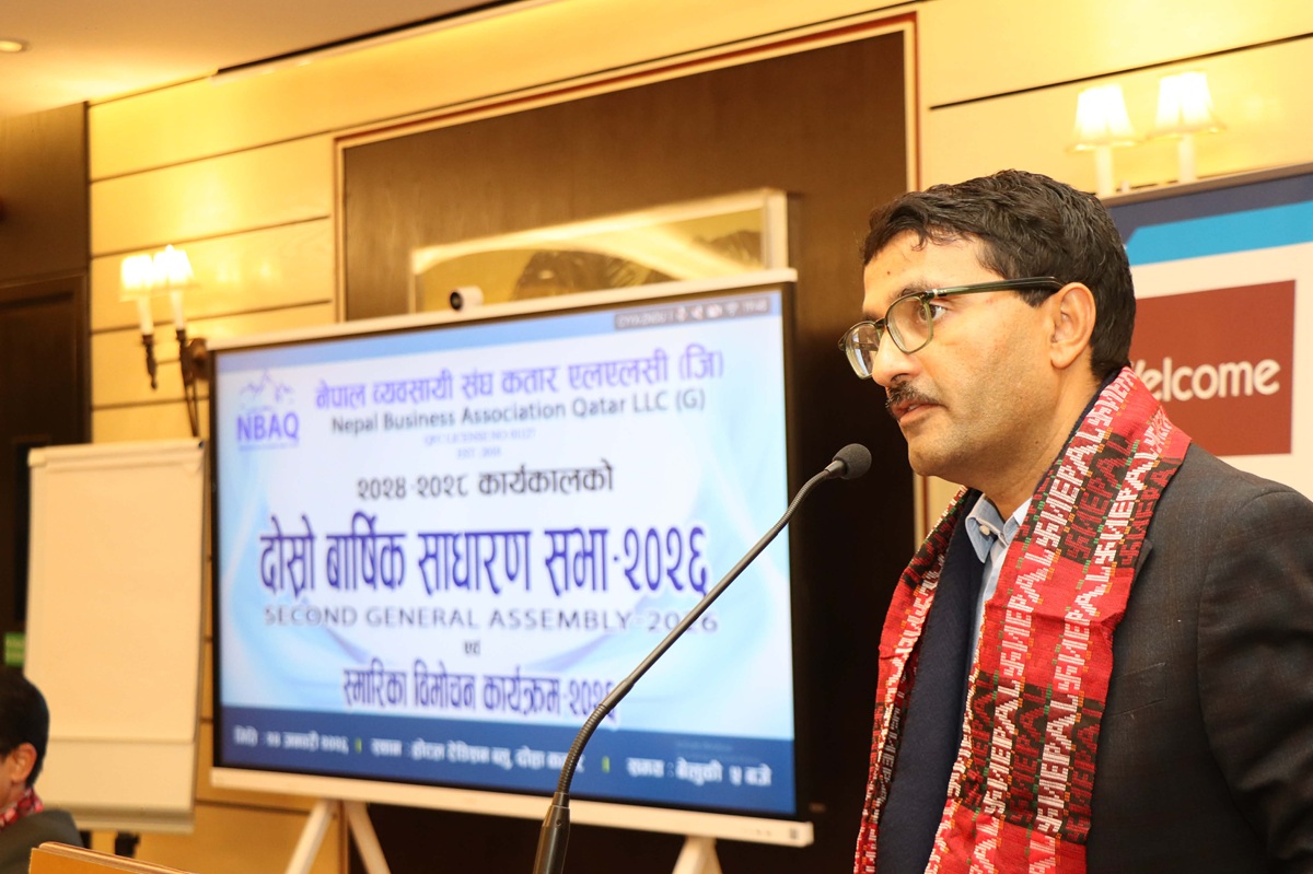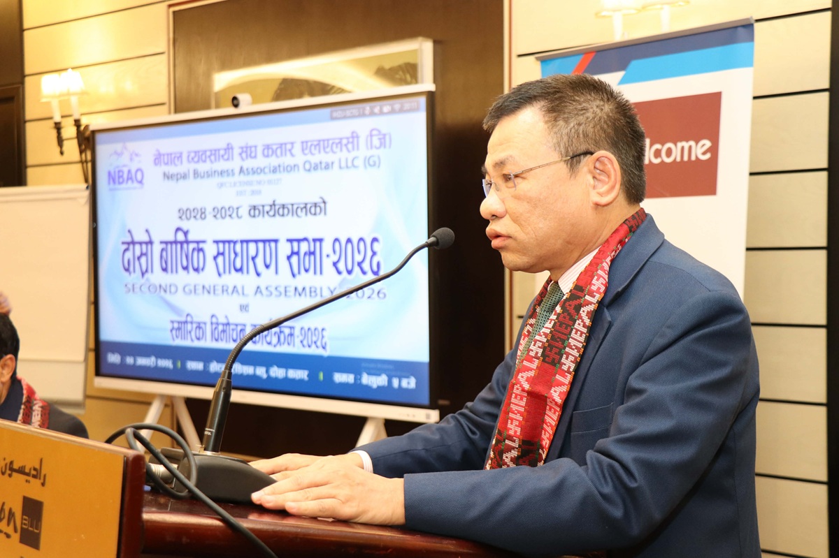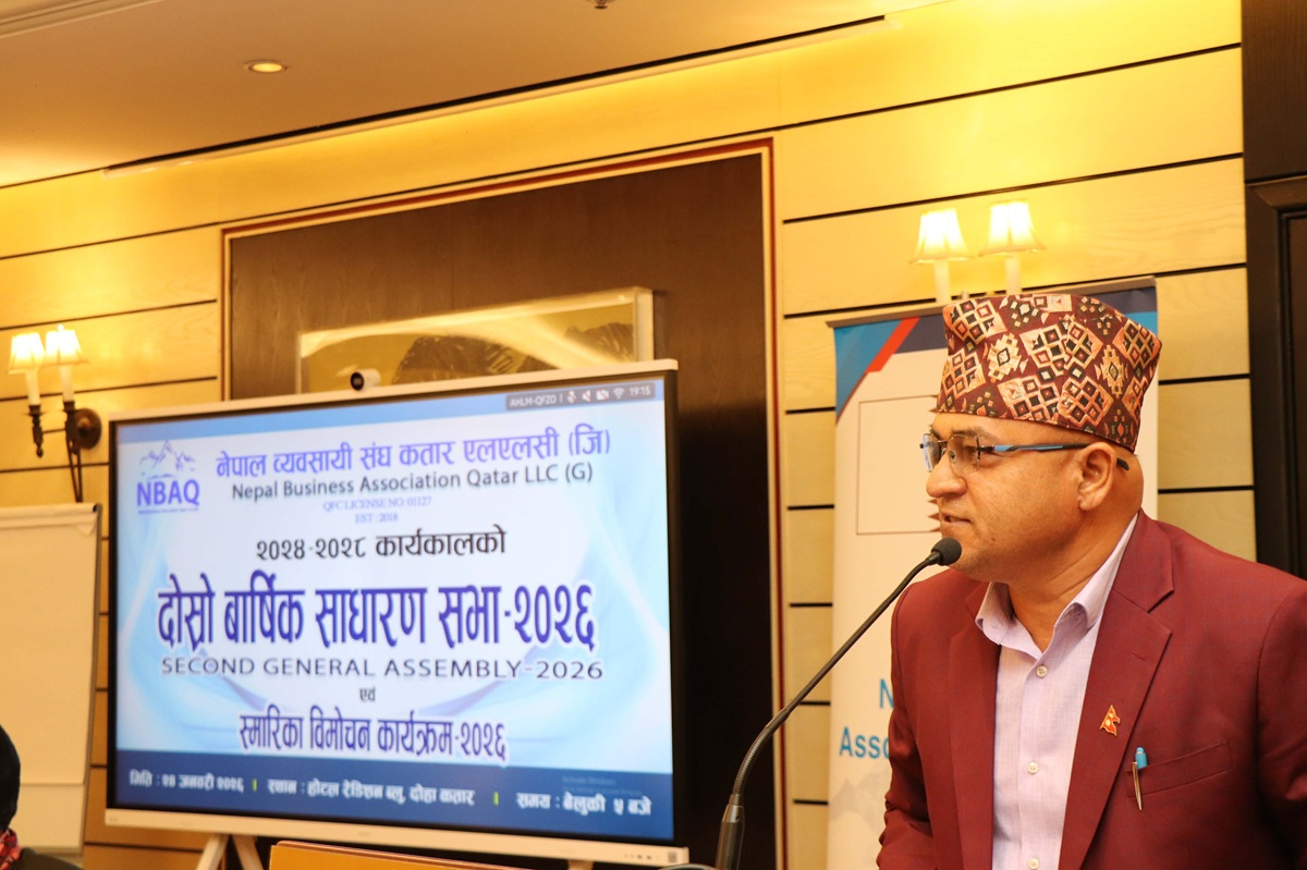 दोहा, कतार : नेपाली दूतावास कतारका मिनिस्ट्री काउन्सिलर तथा का.वा. राजदूत कुमार राईले कतारमा श्रमिकका रूपमा आएर आफ्नो पौरख देखाउँदै श्रमिकबाट सफल व्यवसायी, रोजगारदाता तथा लगानीकर्ता बन्नु गौरवको विषय रहेको बताएका छन् । शनिबार साँझ दोहाको एक होटेलमा सम्पन्न नेपाल व्यवसायी संघ कतार एलएलसी (जी)को २०२४-२८ कार्यकालको दोस्रो वार्षिक साधारण सभा तथा स्मारिका विमोचन कार्यक्रमलाई सम्बोधन गर्दै उनले सो कुरा बताएका हुन् । “नेपालमा राष्ट्रिय विपत्तिहरू आइपर्दा सत्यताका साथ आफ्नो जन्मभूमिलाई धेरै सहयोग गर्दै गुन लगाएका छन्” उनले भने ।