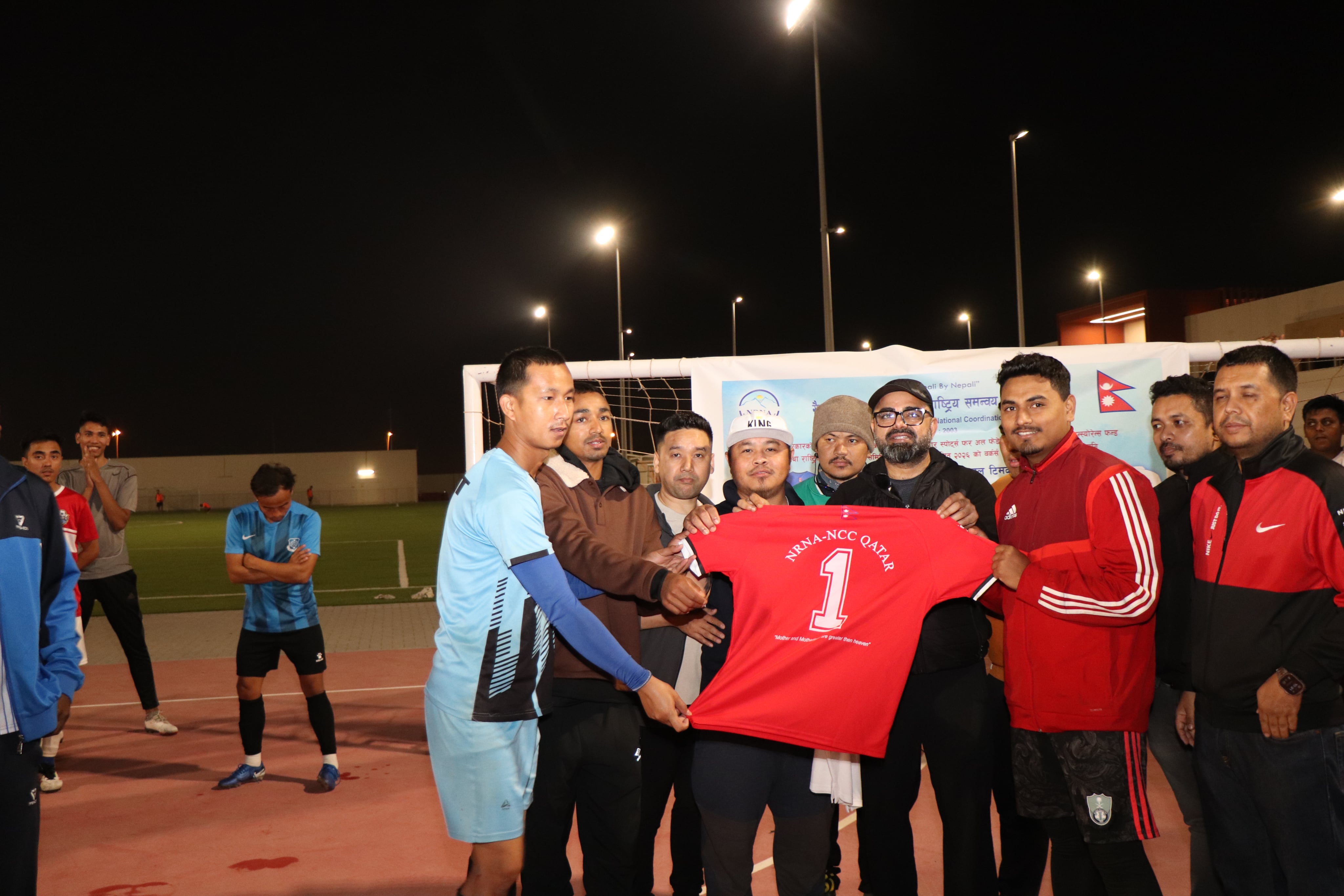 कतारको खेलकुद दिवस अर्थात् यही मंगलबारबाट सुरु भएको प्रतियोगितामा नेपालले भोलि शुक्रबार साँझ ६ बजे आयोजक वर्कर्स सपोर्ट एण्ड इन्स्योरेन्स फण्डसँग अल अहली स्पोर्ट्स क्लबको ग्राउन्डमा खेल्दै छ । भोलि हुने खेलको तयारी र आवश्यक परामर्श सहित खेलाडीको हौसला बढाउन गैरआवासीय नेपाली संघ, राष्ट्रिय समन्वय परिषद् (एनआरएनए एनसिसी) कतारका अध्यक्ष कृष्ण पन्थीसहितको टोली खेलाडीले अभ्यास गरिरहेको ग्राउन्डमै पुगेका थिए । खेलाडीलाई आवश्यक पर्ने सबै जर्सी सहितका सामाग्री पुगेको एनआरएनएको टोलीले खेलाडी सहित टिम म्यानेजरद्धय महेन्द्र राना र मोहन बिस्ट टिम कप्तान अर्जुन सुब्बा र प्रशिक्षक इङ कोरोमा र सहायक प्रशिक्षक मुनाल गुरुङलाल सबै सामाग्री हस्तान्तरण गरेका छन् ।