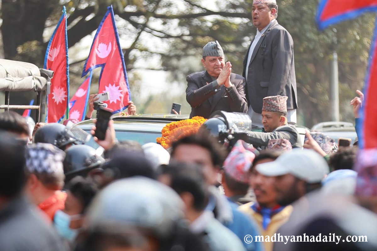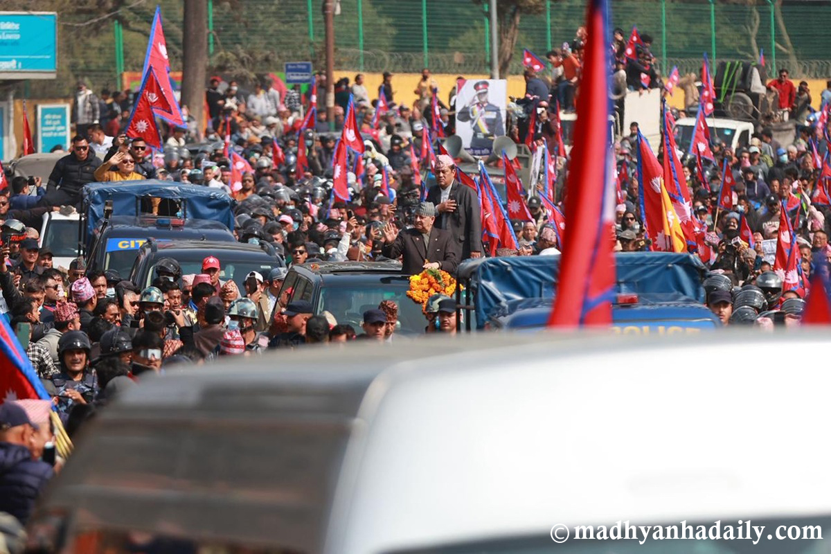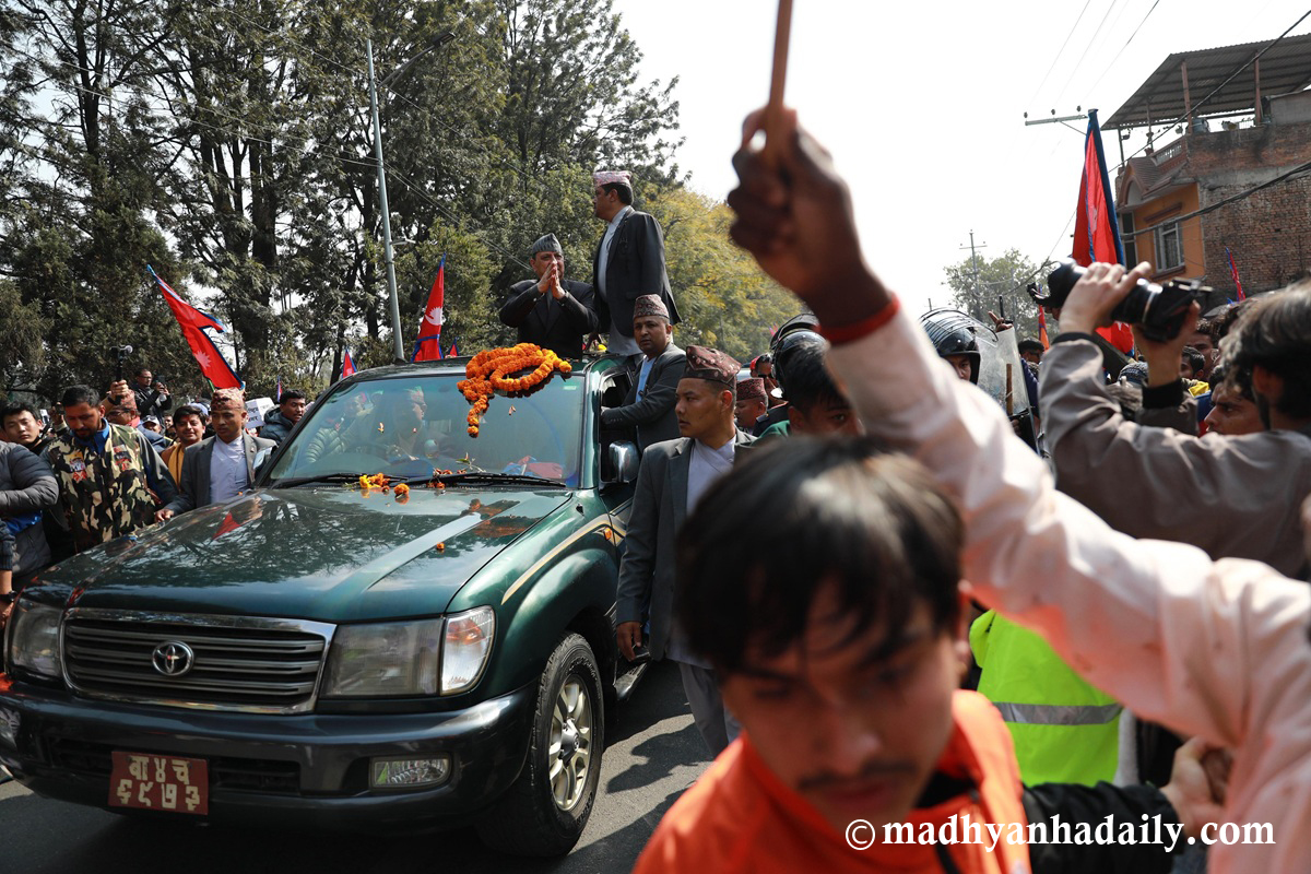 उनको स्वागतमा विमानस्थल बाहिर ठुलो भिड जम्मा भएको थियो । दुर्गा प्रसाईंसहित ठूलो संख्यामा समर्थक विमानस्थल पुगेका थिए । त्यो भिडलाई छिचोल्दै पूर्वराजा ज्ञानेन्द्र निर्मलनिवास पुगेका छन् ।