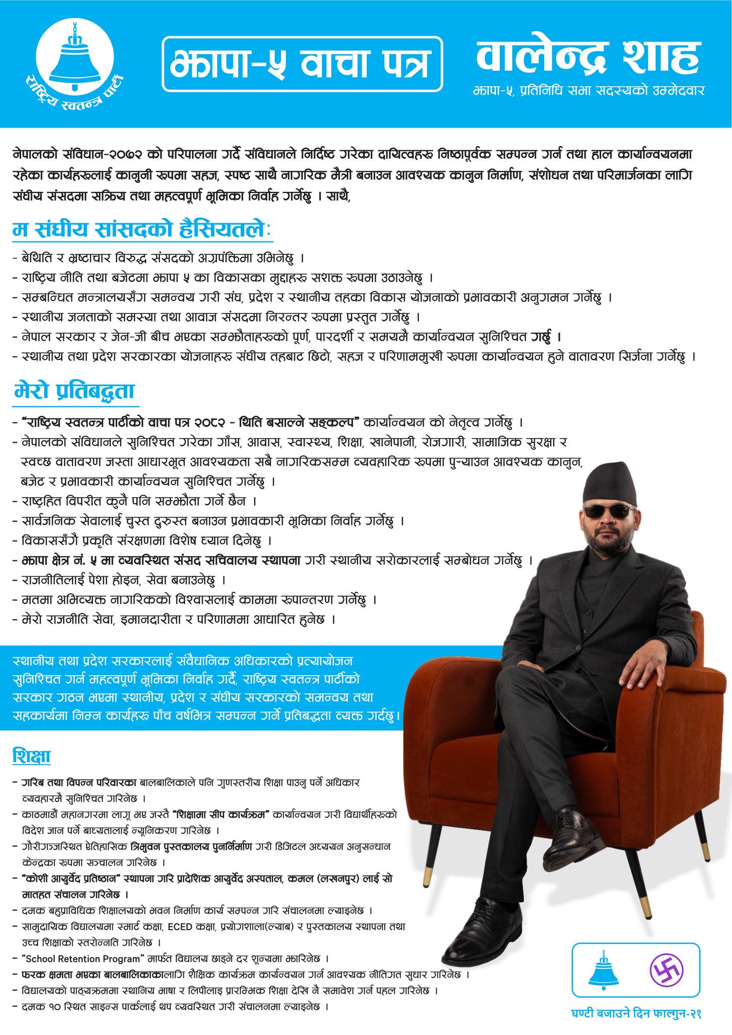 झापा : बालेन्द्र शाहले झापा क्षेत्र नम्बर–५ बाट प्रतिनिधि सभा सदस्यका उम्मेदवारका रूपमा आफ्नो विस्तृत चुनावी वाचापत्र सार्वजनिक गरेका छन् । संविधानको परिपालना, सुशासन र भ्रष्टाचारविरुद्ध शून्य सहनशीलताको प्रतिबद्धतासहित उनले शिक्षा, स्वास्थ्य, कृषि, पूर्वाधार, भूमि व्यवस्थापन र रोजगारीलाई मुख्य प्राथमिकतामा राख्दै पाँच वर्षे कार्ययोजना अघि सारेका हुन् ।