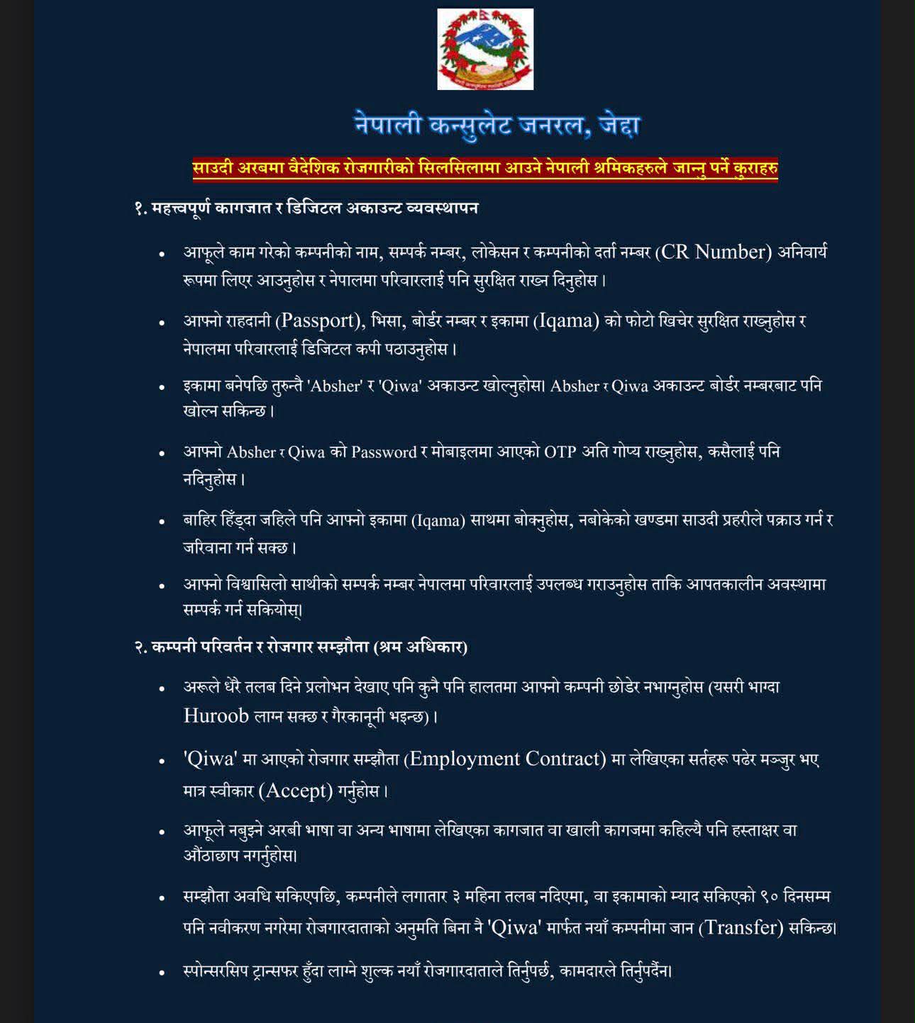 कन्सुलेटले श्रमिकहरूलाई आफ्नो कम्पनीको नाम, सम्पर्क नम्बर, कार्यालयको ठेगाना र कम्पनीको दर्ता नम्बर (CR Number) सुरक्षित रूपमा राख्न तथा राहदानी, भिसा, बोर्डिङ पास र इकामा (Iqama) का प्रतिलिपि आफूसँगै सुरक्षित राखी नेपालस्थित परिवारलाई समेत डिजिटल माध्यमबाट उपलब्ध गराउन अनुरोध गरेको छ । इकामा प्राप्त भएपछि ‘Absher’ र ‘Qiwa’ मा व्यक्तिगत खाता अनिवार्य रूपमा खोल्न तथा पासवर्ड र ओटीपी गोप्य राख्न विशेष जोड दिइएको छ ।