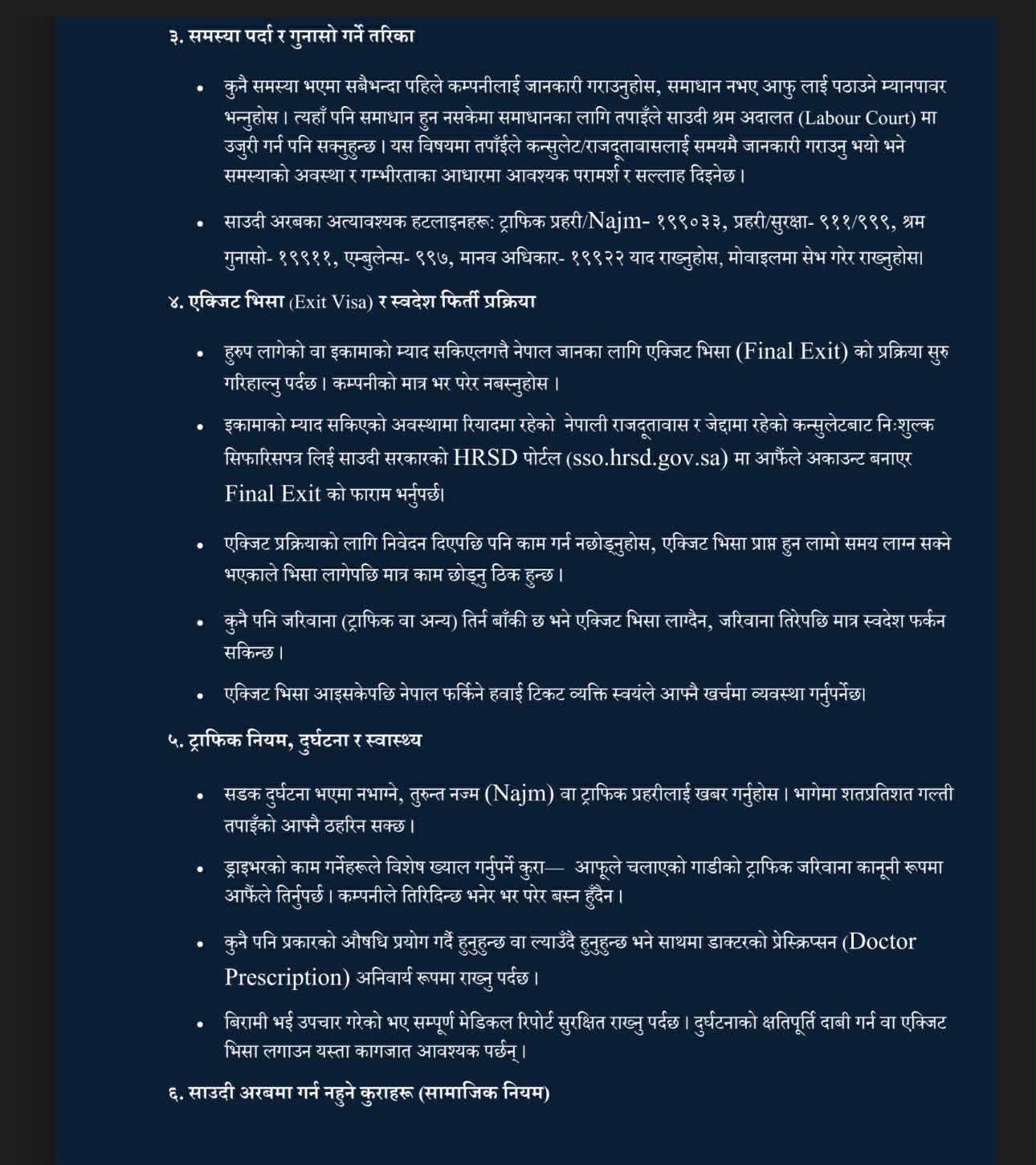 एक्जिट भिसा (Final Exit) सम्बन्धी प्रक्रियामा हुरुब लागेको वा इकामा म्याद समाप्त भएको अवस्थामा दूतावास वा कन्सुलेटको सिफारिससहित HRSD पोर्टलमार्फत प्रक्रिया अगाडि बढाउन सकिने जनाइएको छ । एक्जिट भिसा प्राप्त भएपछि मात्र काम छाड्न र बाँकी जरिवाना तिरेपछि मात्रै स्वदेश फर्कन सकिने स्पष्ट पारिएको छ ।