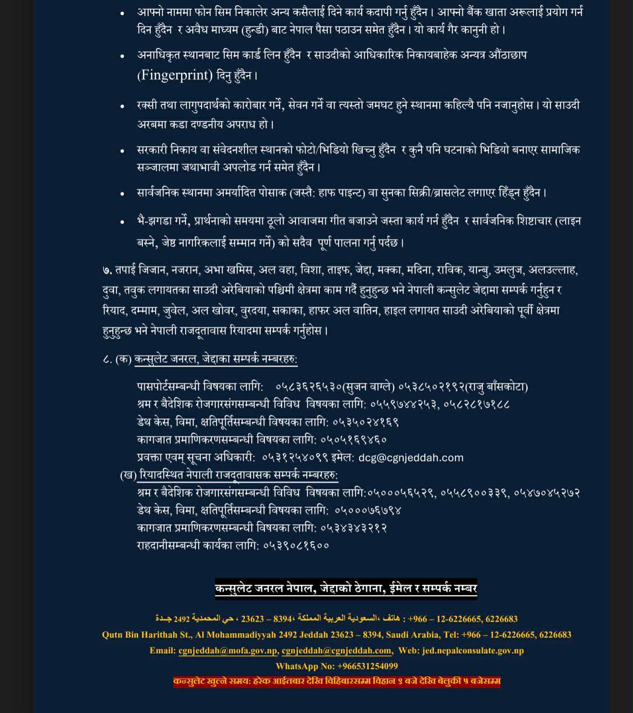कन्सुलेटले साउदीको पश्चिम क्षेत्रमा कार्यरत नेपालीलाई जेद्दास्थित कन्सुलेट र पूर्व क्षेत्रमा कार्यरतलाई रियादस्थित नेपाली राजदूतावाससँग सम्पर्क गर्न आग्रह गरेको छ । राहदानी, श्रम, बीमा, क्षतिपूर्ति तथा अन्य कन्सुलर सेवासम्बन्धी परामर्शका लागि सम्पर्क विवरणसमेत सार्वजनिक गरिएको छ ।